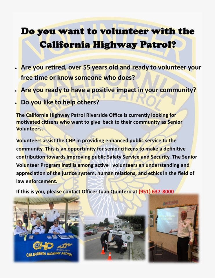 RIVERSIDE COUNTY, CA — The California Highway Patrol is expanding its volunteer program, seeking individuals 55 and older to assist in the Riverside office and throughout the community.
