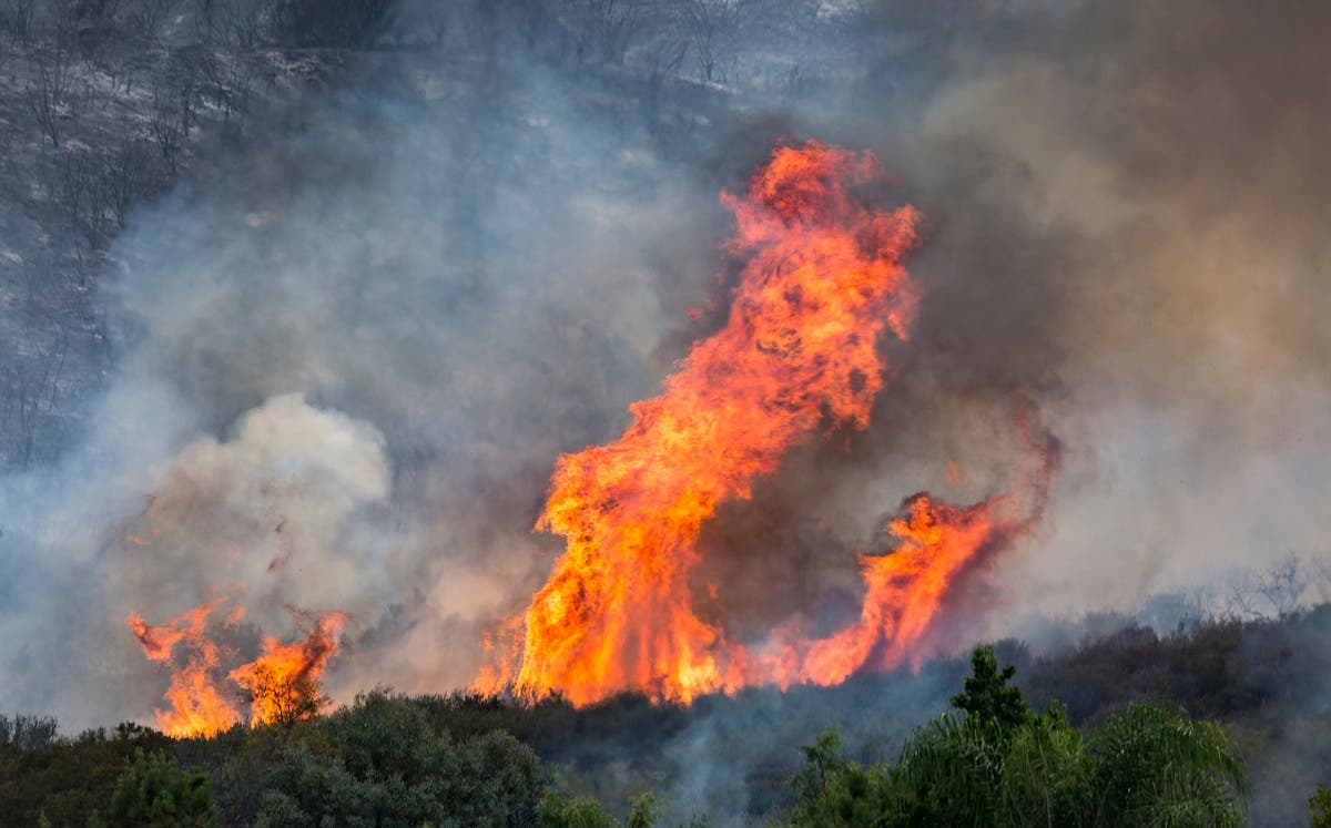 The blaze was first reported about 2:20 p.m. Monday in the 14800 block of Amorose Street, near Grand Avenue, on the edge of the Cleveland National Forest, fire officials reported. It was only 10 percent contained as of 9 p.m. Monday.