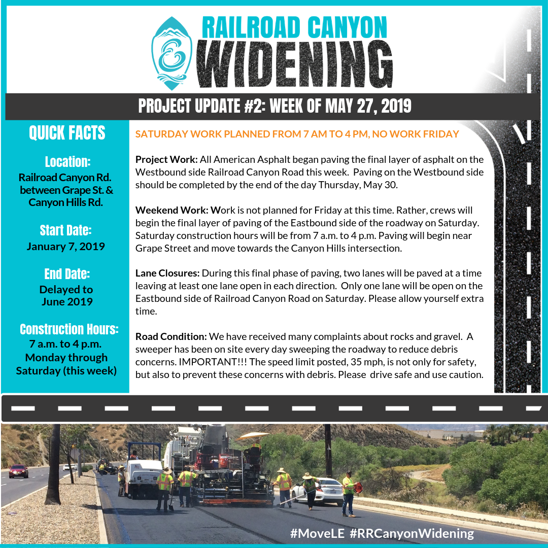 During this final phase of paving, two lanes will be paved at a time leaving at least one lane open in each direction. Only one lane will be open on the Eastbound side of Railroad Canyon Road on Saturday. Please allow yourself extra time.