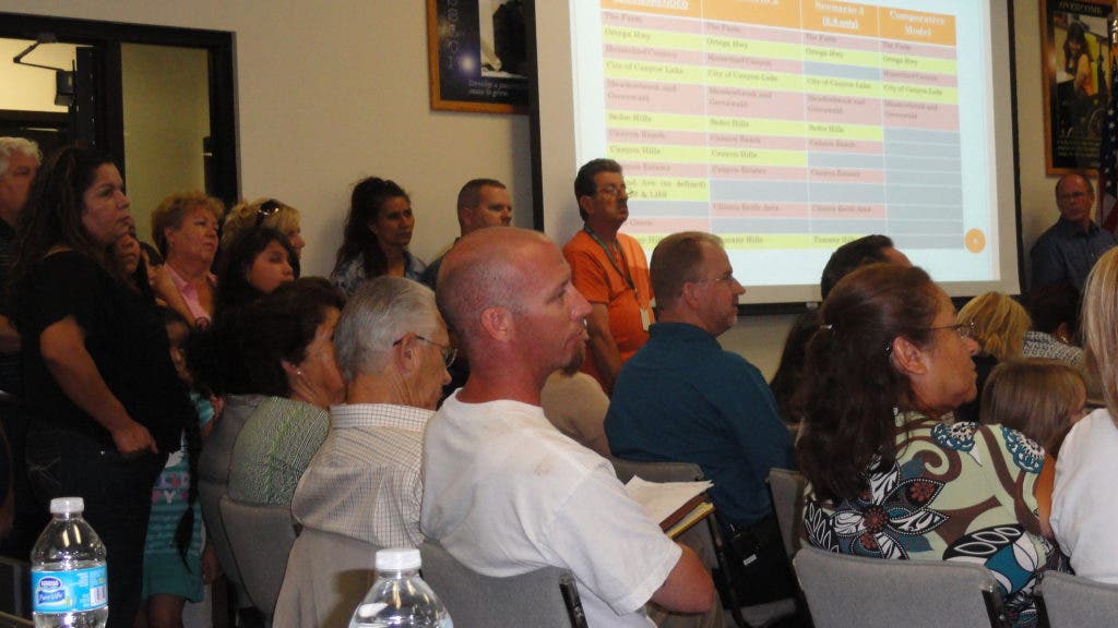 It was standing room only Monday night at the Lake Elsinore Unified School District headquarters as nearly 100 people turned out to hear if there would be yellow buses running when school starts Aug. 13.