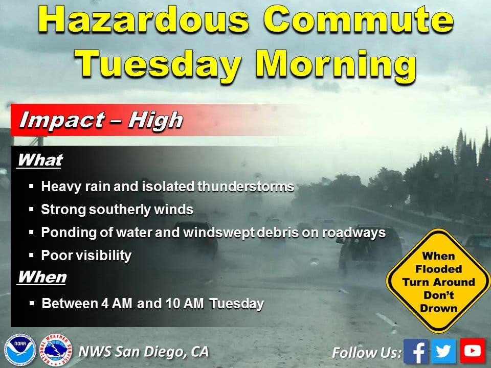 The storm will bring periods of snow and strong winds beginning late Monday evening and continue into Tuesday evening. Heavy, wet snow is expected in Crestline, Lake Arrowhead, Big Bear City, Big Bear Lake, Running Springs, Wrightwood and Idyllwild-Pine Cove.