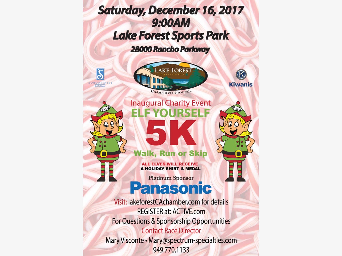 The Lake Forest Chamber of Commerce is sponsoring its inaugural charity 5K run, walk, and skip. It will be held on December 16 starting at 9 am at the Lake Forest Sports Park. Panasonic is the platinum sponsor and funds will be shared with Kiwanis and Soroptimists.