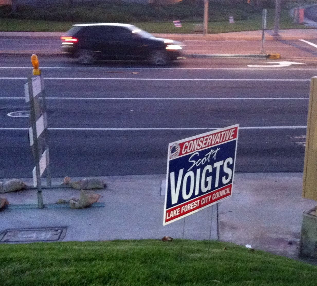 After receiving several complains, Lake Forest enforcement staff ordered Voigts to cease and desist, then went around and documented Voigt’s violations. The Voigts sign in the picture was at the Lake Forest corner of Bake Pkwy and Trabuco. Several more signs were reported on Bake and even more were reported near Rockfield and Lake Forest Drive. There were also signs on the Irvine side of Bake Pkwy, however, those signs did not violate the Lake Forest laws.