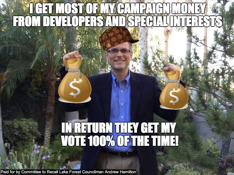 - Hamilton voted to spend $250,000 more on street sweeping so the company that gave money to his campaign could get the contract. (5/19/15)