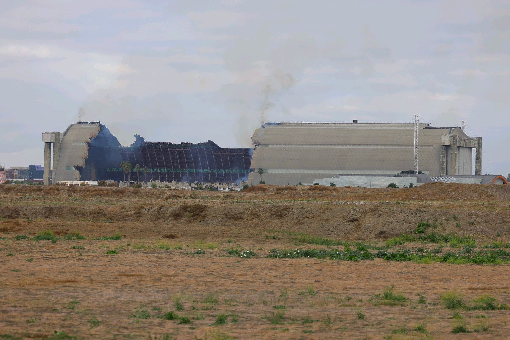 The fire is in a facility where hangars once housed blimps used in World War II. They stand 17 stories high, are over 1,000 feet long and 300 feet wide. They were, and still are, two of the largest wooden structures ever built, according to the website Tustin Hangars.