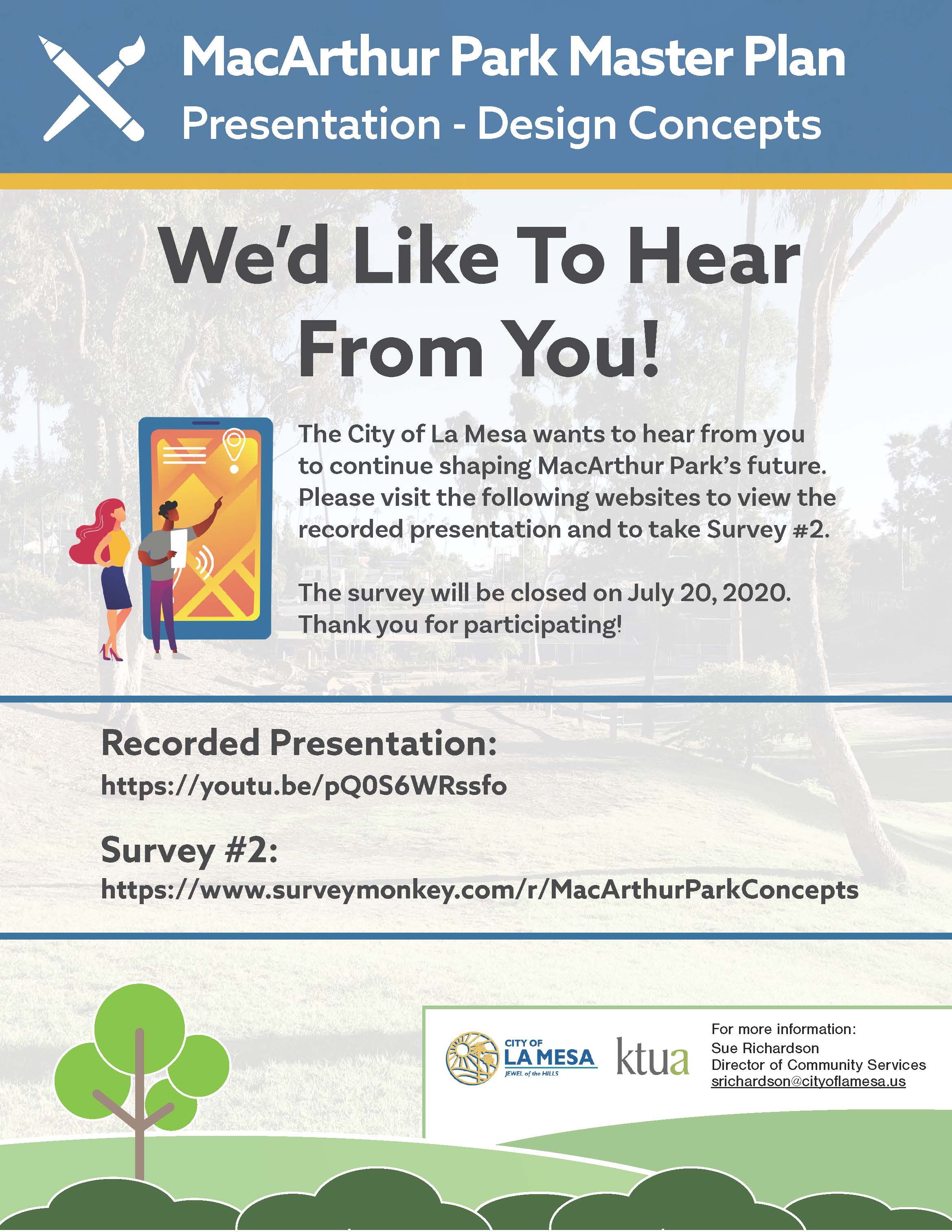 The City of La Mesa’s project team will present the two design concepts for the MacArthur Park Master Plan formulated from previous public input. Please view the attached video (Full 22 minute presentation https://youtu.be/pQ0S6WRssfo or 14 minute condensed version https://youtu.be/Vh5v-3oStBw) and then take the online survey to provide your input at https://www.surveymonkey.com/r/MacArthurParkConcepts.