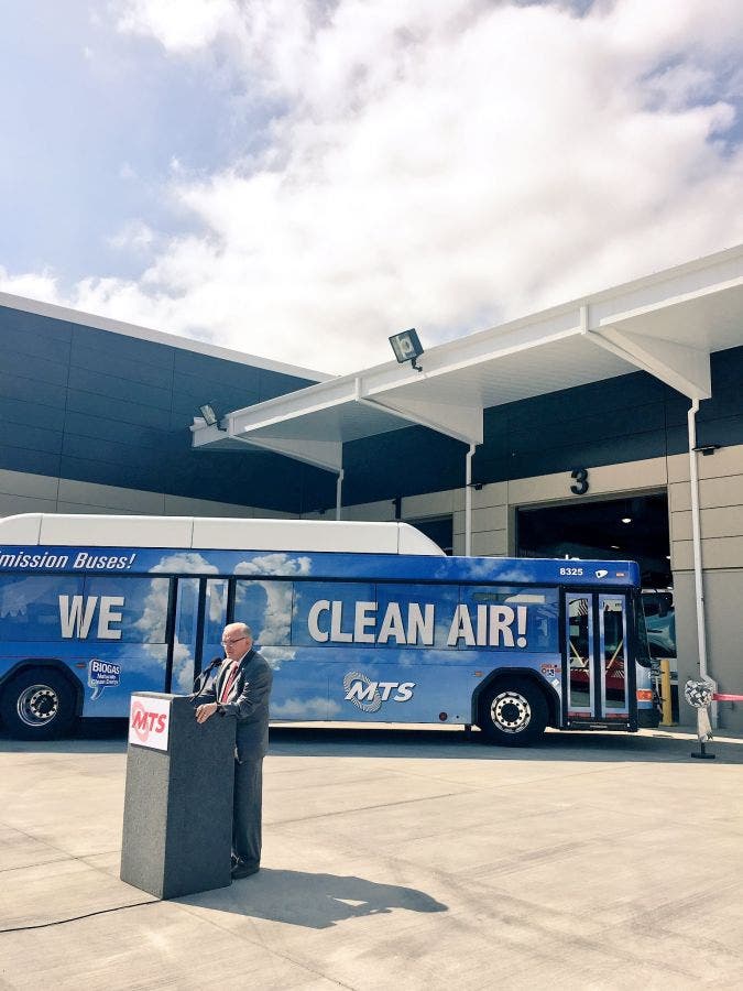 - City News Service / Image: SDMTS Board Chair Harry Mathis kicks-off the grand opening of the new East County Bus Maintenance Facility & new CNG fleet via @sdmts Twitter