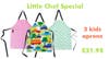 What: $9.95 Runners and Mimi Home Placemats, $12.95 teatowels, $19.95 picnic tablecloths, 2 pencil cases for $9.95, 2 bibs for $9.95, adult aprons, and more.
