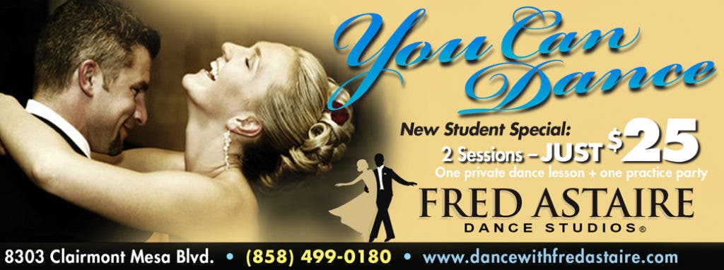 Enjoy a special offer from the Fred Astaire Dance Studio San Diego. This special new student offer includes 1 30 minute private dance lesson as well as 1 dance party for $25 To schedule your first lesson call 8584990180 and ask for Mary!
