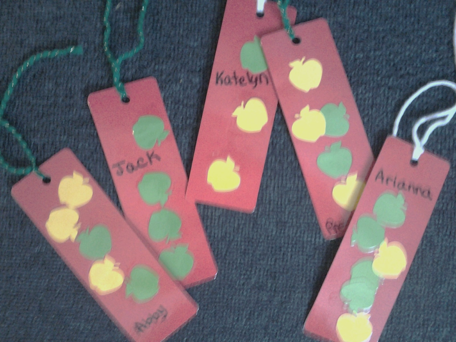 The children pasted down little yellow and green paper apples onto a red bookmark. I enjoy seeing how some children choose a few apples while others add many more. After laminating them, they picked either white or green yarn for the tassel of the bookmark. Here's a picture of a some of the finished bookmarks.