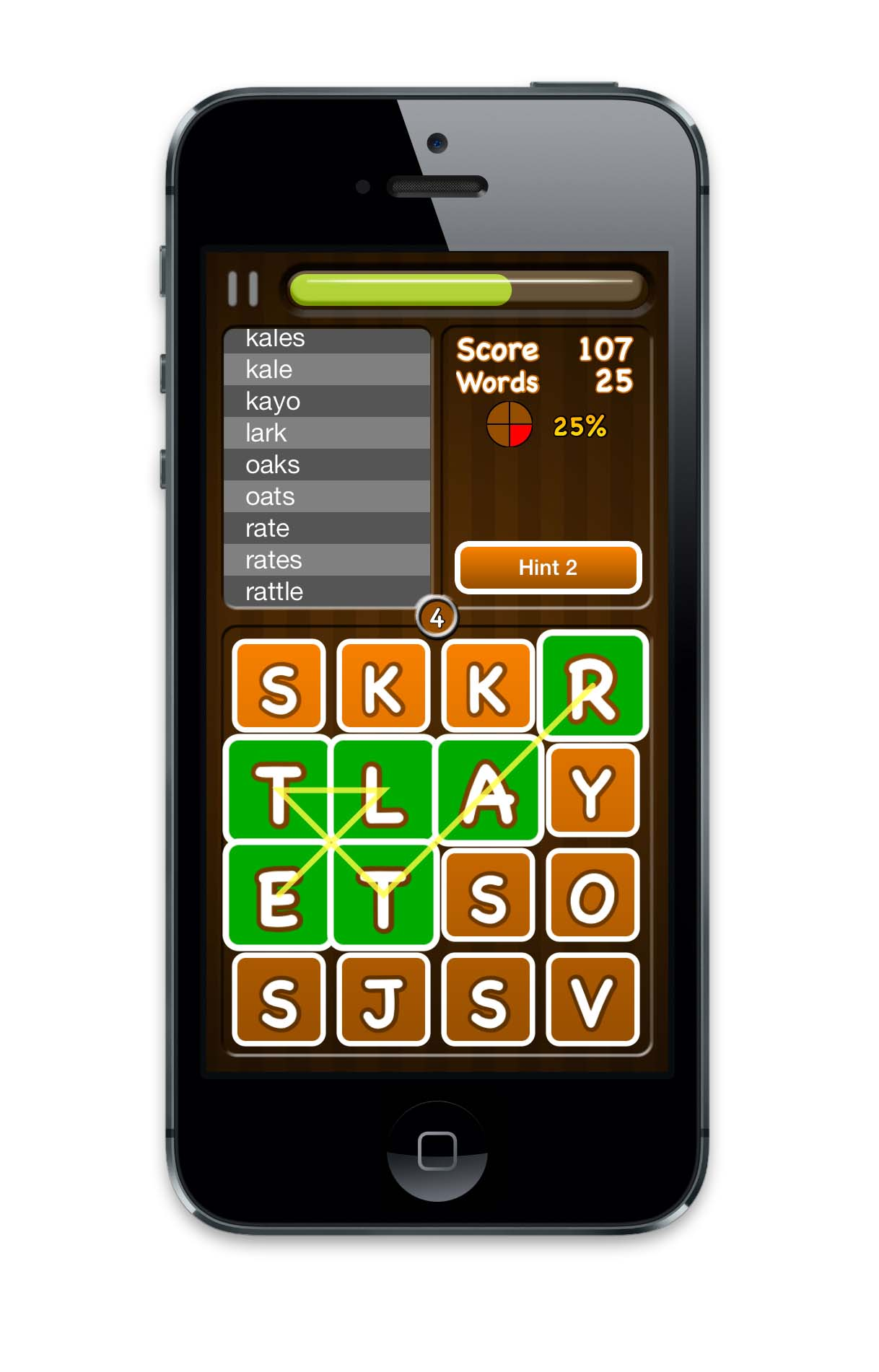 Racing the clock, players must find as many words as they can before time expires. They can increase the time limit and prolong their game by finding words quickly and reaching milestones, making the game exciting and rewarding at the same time. Each of the four levels offers six goals to reach.
