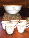 Tom & Jerry still cute after 50 years. A set of five mugs and a 10-inch eggnog bowl in cream with gold trim, and "Tom and Jerry" imprinted on every piece--all $15.