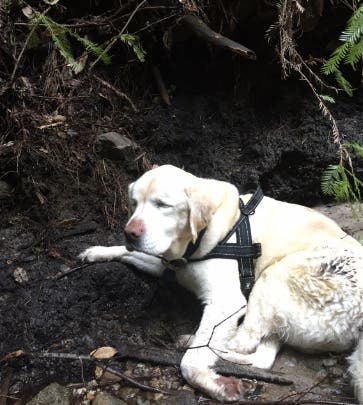 SANTA CRUZ COUNTY, CA — One more night by the stream and she would probably wouldn’t have survived. A blind Labrador Retriever who had been missing for eight days and seven nights was found lying on the forest floor, seemingly lifeless, by an off-duty firefighter and his friend out for a hike in Santa Cruz County last Saturday.