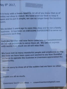 LIVERMORE, CA — A popular ice cream shop has suddenly shuttered in Livermore. The Livermore Ice Cream Shop, which was originally named CREAM (Cookies Rule Everything Around Me), abruptly closed after three years in downtown Livermore, according to a letter from the store.