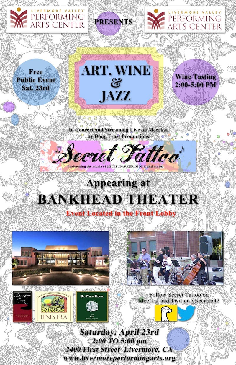 Live jazz with energy, featuring the amazing jazz band "Secret Tattoo" in concert one day only. It's a free to the public event presented by The Livermore Valley Performing Arts Center. This event will be streaming live to Meekcat and Twitter @secrettat2