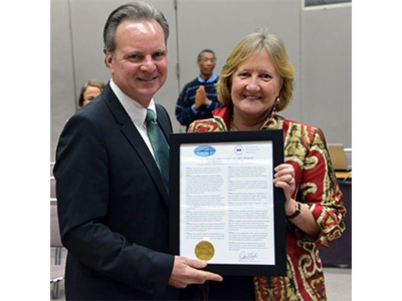 In his first duty as the incoming MTC chair, Cortese presents outgoing Chair Amy Worth with a resolution of appreciation. (Photo by Peter Beeler)