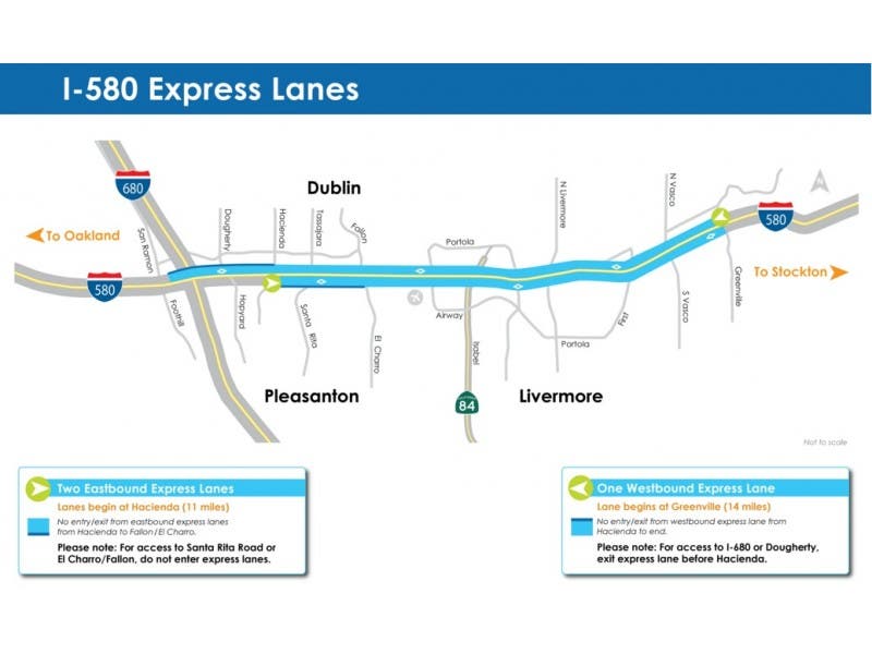 Operated by the Alameda County Transportation Commission and enforced by the California Highway Patrol, the express lanes feature two eastbound lanes and one westbound express lane through the Tri-Valley corridor between San Ramon Road/Foothill Road and Greenville Road. They will operate Monday through Friday from 5 a.m. to 8 p.m.