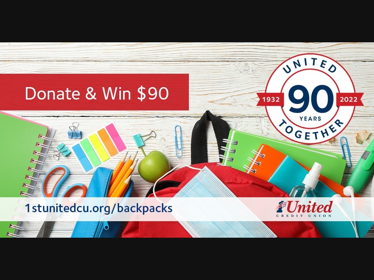 In celebration of our 90th year of service, 1st United will enter your name into a drawing to win a $90 gift card, just for donating. Learn more and find the nearest branch at 1stunitedcu.org/backpacks.