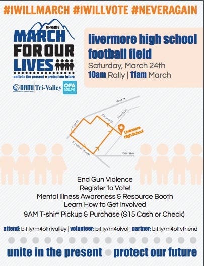 The Tri-Valley event is sponsored by NAMI-Tri-Valley and Organizing for Action EBC Tri-Valley team. Livermore High is located at 600 Maple St.