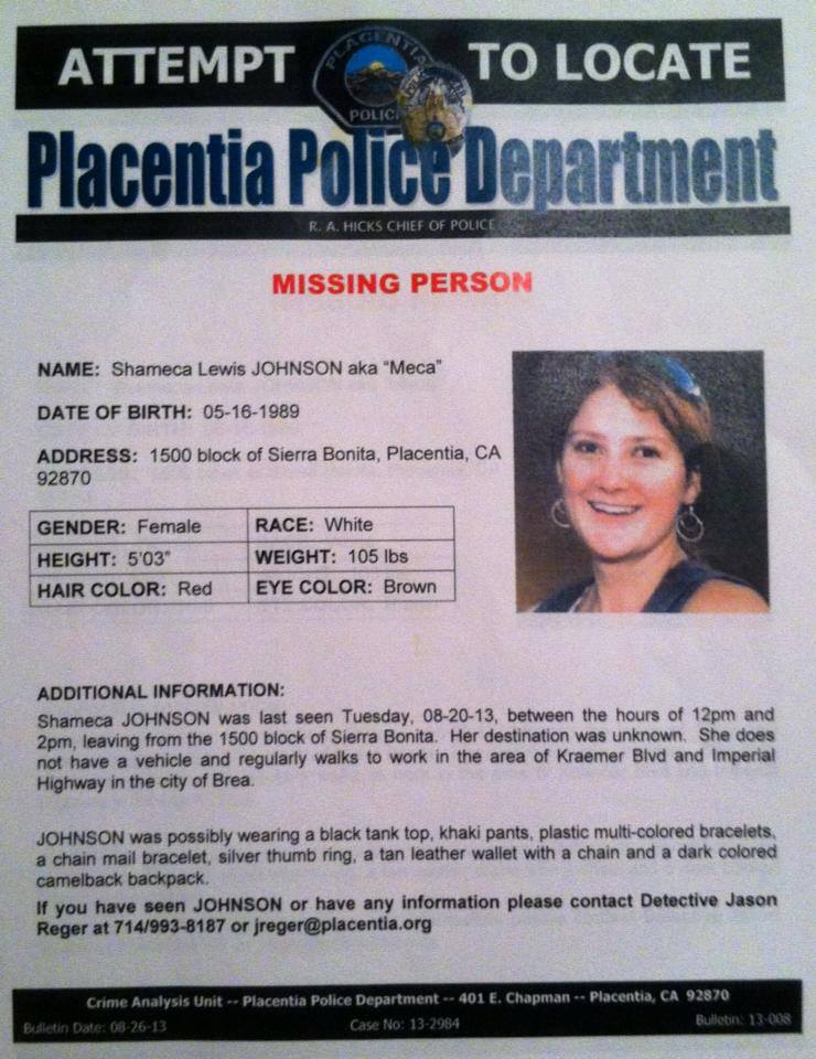 Shameca Lewis Johnson was last seen about noon to 2 p.m., Aug. 20, when she left her home in the 1500 block of Sierra Bonita, Placentia police Detective Corinne Loomis said.