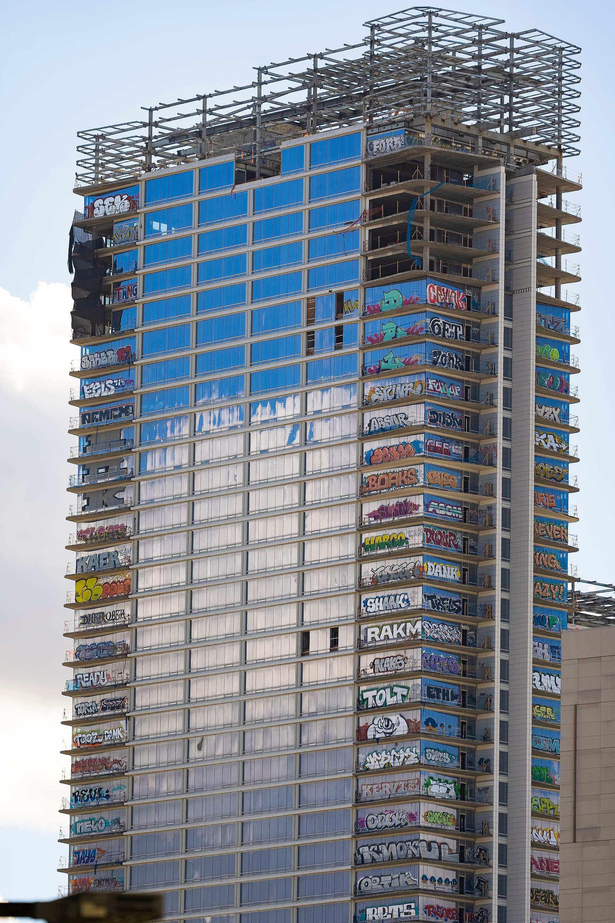 The tagging happened Tuesday night. Los Angeles police were called to respond to a report of vandalism at a construction site in the 1200 block of South Figueroa Street. A tactical flight officer with Los Angeles Police Department's Air Support Division observed over a dozen suspects in the building, trespassing and possibly spray-painting on the building, according to police. by the time additional patrol units arrived, most of the suspects had fled. Police arrested the two that remained.