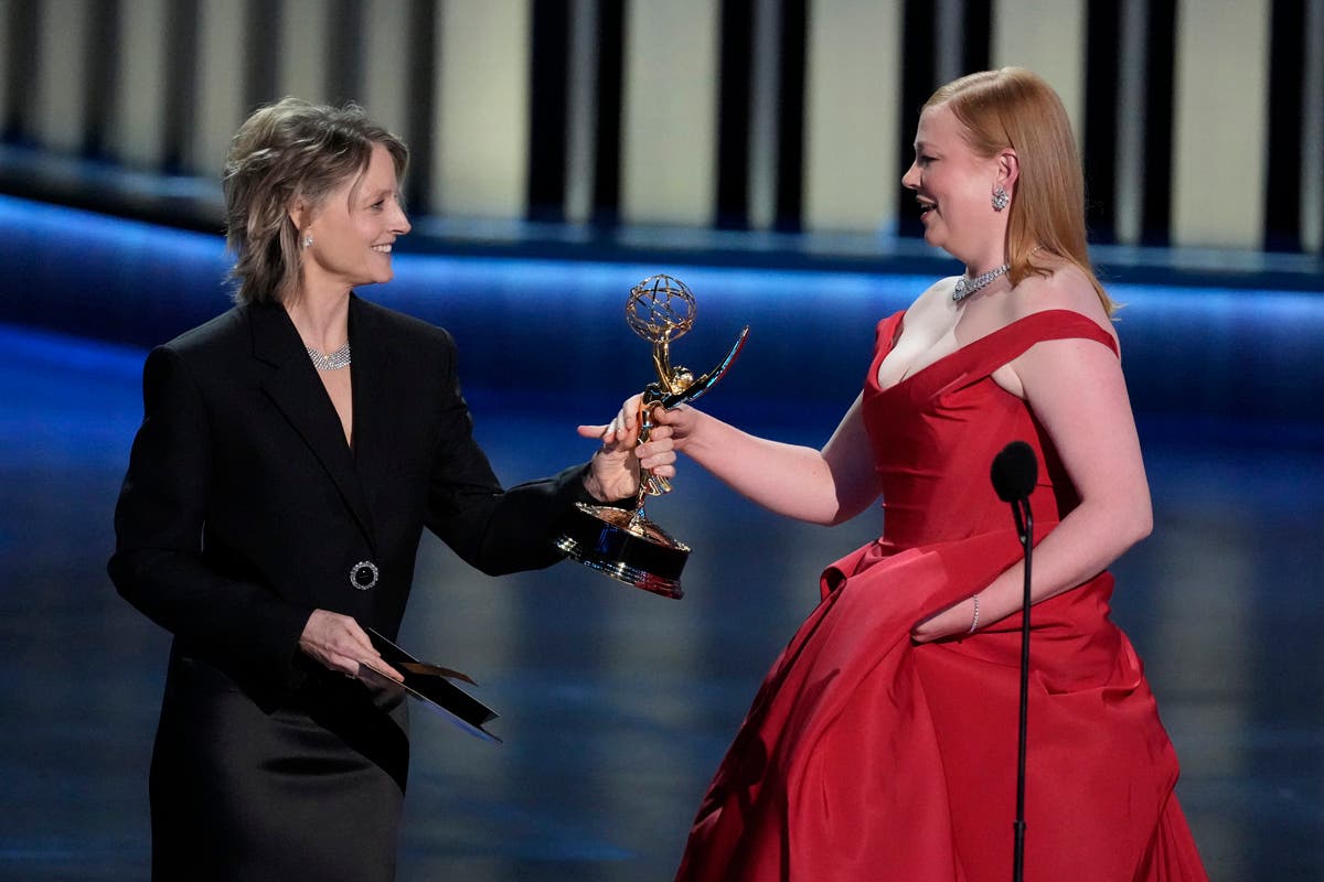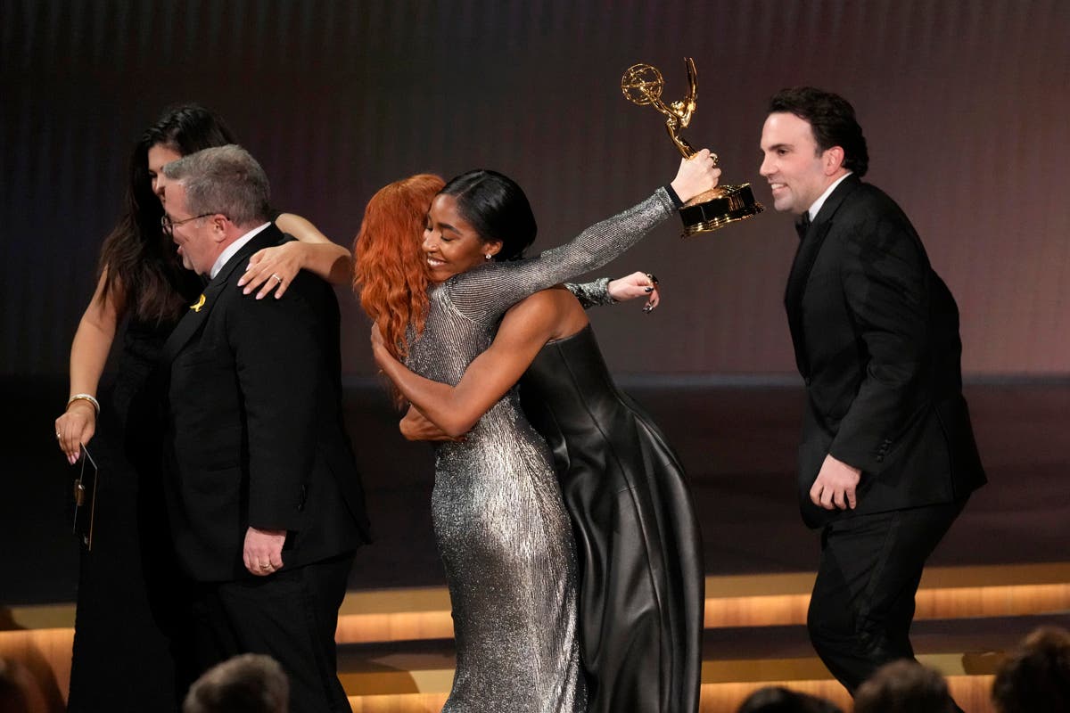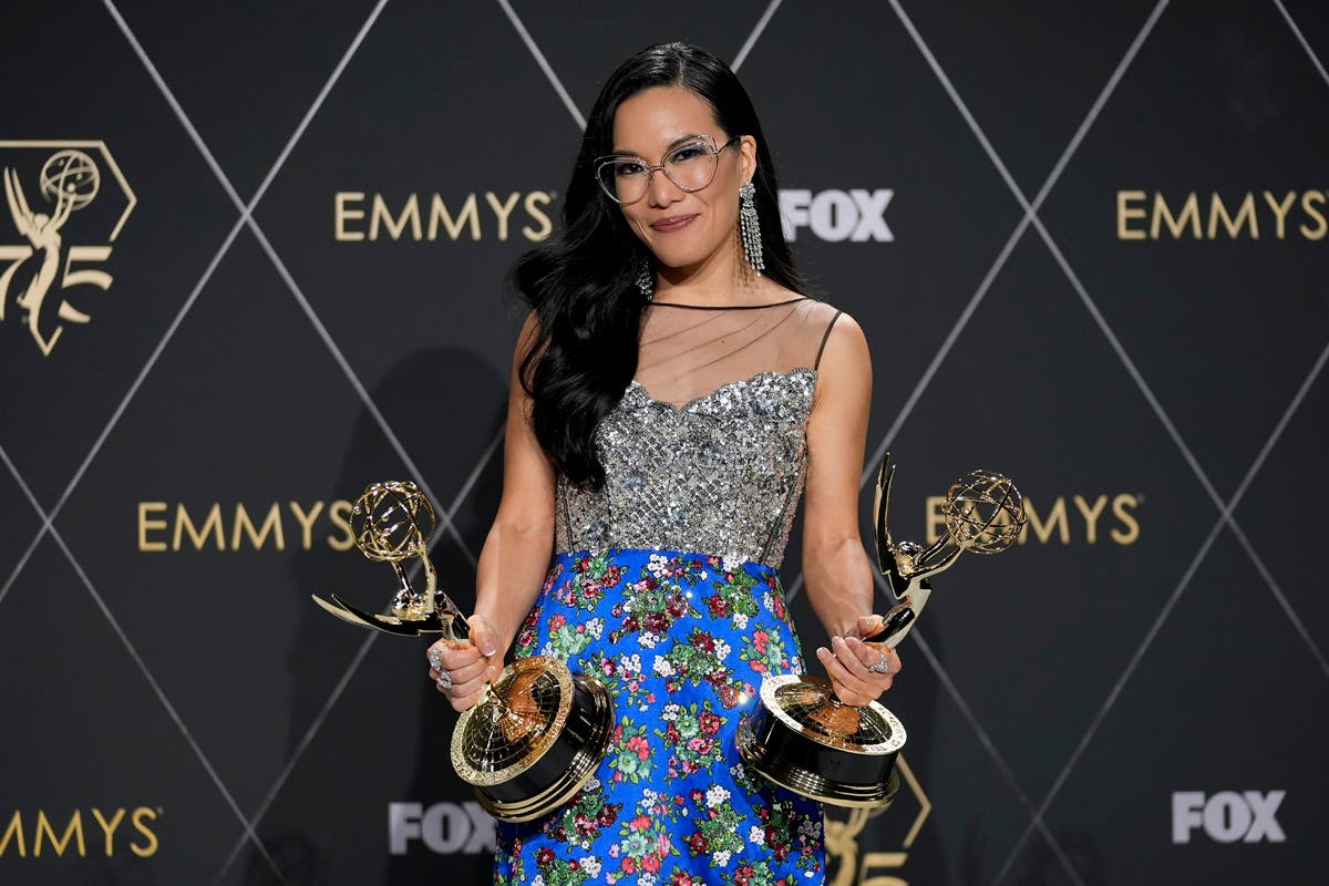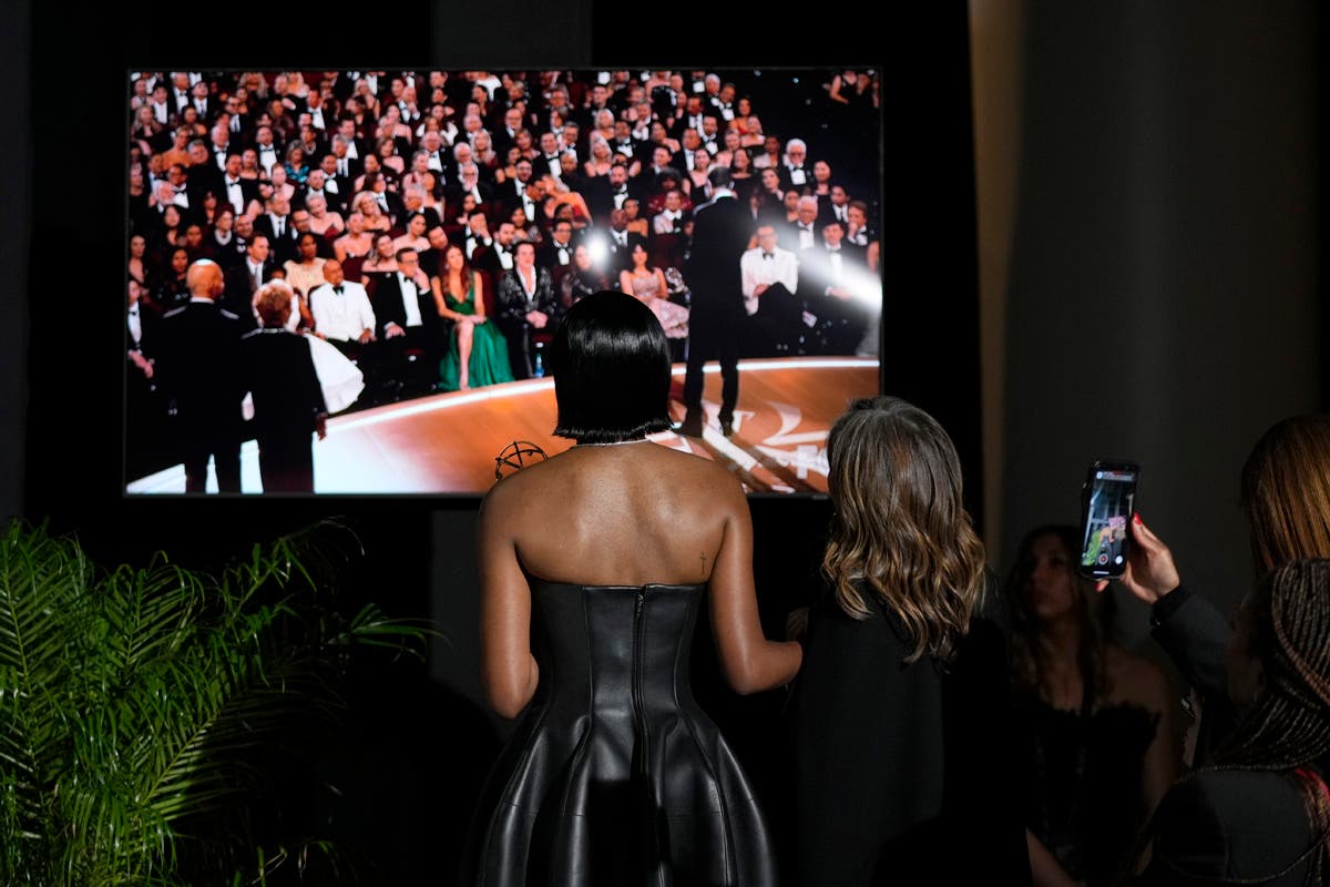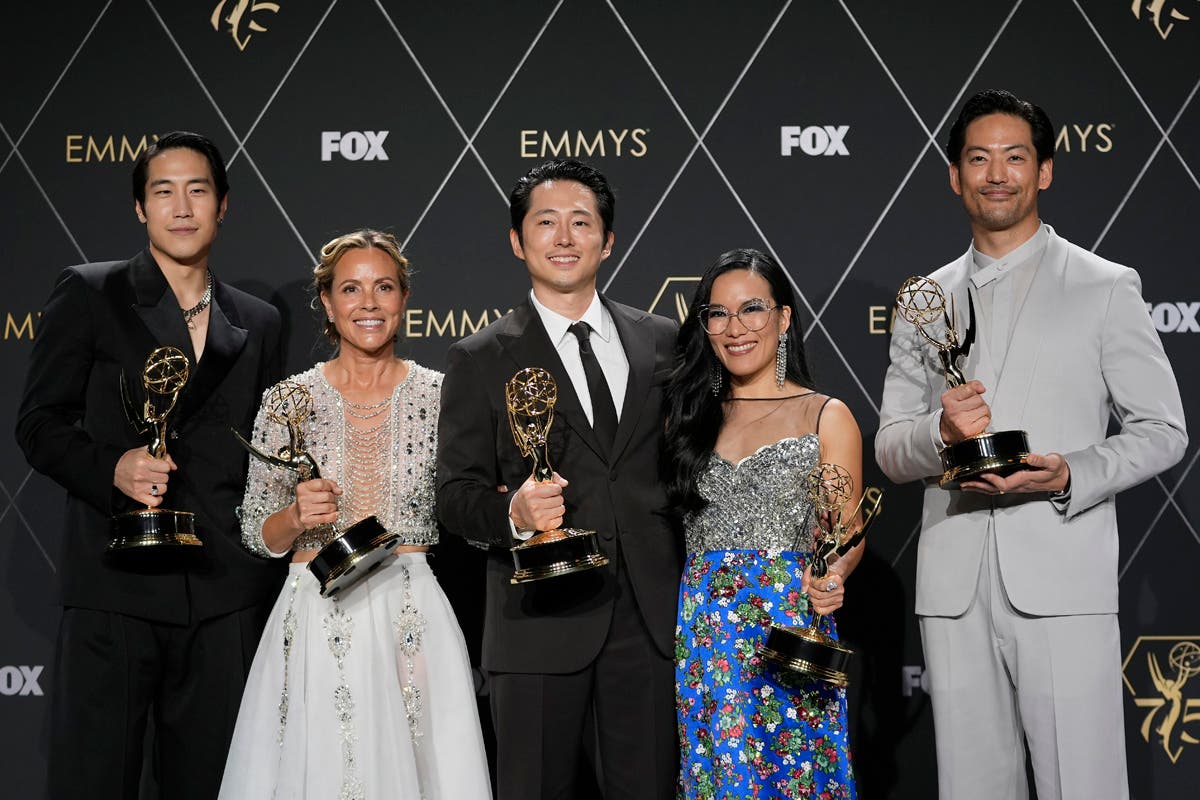 Christina Applegate, left, presents the award for outstanding supporting actress in a comedy series during the 75th Primetime Emmy Awards on Monday, Jan. 15, 2024, at the Peacock Theater in Los Angeles. (AP Photo/Chris Pizzello)Host Anthony Anderson appears in a reenactment of a scene from "The Sopranos" during the 75th Primetime Emmy Awards on Monday, Jan. 15, 2024, at the Peacock Theater in Los Angeles. (AP Photo/Chris Pizzello)Jennifer Coolidge accepts the award for outstanding supporting actress in a drama series for "The White Lotus" during the 75th Primetime Emmy Awards on Monday, Jan. 15, 2024, at the Peacock Theater in Los Angeles. (AP Photo/Chris Pizzello)Matthew Macfadyen accepts the award for outstanding supporting actor in a drama series for "Succession" during the 75th Primetime Emmy Awards on Monday, Jan. 15, 2024, at the Peacock Theater in Los Angeles. (AP Photo/Chris Pizzello)Niecy Nash-Betts accepts the award for outstanding supporting actress in a limited or anthology series or movie for "Dahmer – Monster: The Jeffrey Dahmer Story" during the 75th Primetime Emmy Awards on Monday, Jan. 15, 2024, at the Peacock Theater in Los Angeles. (AP Photo/Chris Pizzello)Rhea Perlman, from left, Kelsey Grammar, Ted Danson, John Ratzenberger, George Wendt present the award for outstanding writing for a comedy series during the 75th Primetime Emmy Awards on Monday, Jan. 15, 2024, at the Peacock Theater in Los Angeles. (AP Photo/Chris Pizzello)Charlie Day, from left, Glenn Howerton, Rob McElhenney, Kaitlin Olson, and Danny DeVito present the award for outstanding variety talk series during the 75th Primetime Emmy Awards on Monday, Jan. 15, 2024, at the Peacock Theater in Los Angeles. (AP Photo/Chris Pizzello)Ayo Edebiri, winner of the award for outstanding supporting actress in a comedy series for "The Bear," watches the show from inside the press room during the 75th Primetime Emmy Awards on Monday, Jan. 15, 2024, at the Peacock Theater in Los Angeles. (AP Photo/Ashley Landis)Chandra Wilson, from left, Justin Chambers, Ellen Pompeo, Katherine Heigl, and James Pickens Jr., present the award for outstanding supporting actor in a limited anthology series or movie during the 75th Primetime Emmy Awards on Monday, Jan. 15, 2024, at the Peacock Theater in Los Angeles. (AP Photo/Chris Pizzello)Christina Applegate introduces Carol Burnett during the 75th Primetime Emmy Awards on Monday, Jan. 15, 2024, at the Peacock Theater in Los Angeles. (AP Photo/Chris Pizzello)Tina Fey, left, and Amy Poehler present the award for outstanding variety special (live) during the 75th Primetime Emmy Awards on Monday, Jan. 15, 2024, at the Peacock Theater in Los Angeles. (AP Photo/Chris Pizzello)Ali Wong, left, embraces Steven Yeun after he wins the award for outstanding lead actor in a limited or anthology series or movie for "Beef" during the 75th Primetime Emmy Awards on Monday, Jan. 15, 2024, at the Peacock Theater in Los Angeles. (AP Photo/Chris Pizzello)Steven Yeun, winner of the awards for outstanding lead actor in a limited or anthology series or movie and outstanding limited or anthology series for "Beef," poses in the press room during the 75th Primetime Emmy Awards on Monday, Jan. 15, 2024, at the Peacock Theater in Los Angeles. (AP Photo/Ashley Landis)Ali Wong, winner of the awards for outstanding lead actress in a limited or anthology series or movie and outstanding limited or anthology series for "Beef," poses in the press room during the 75th Primetime Emmy Awards on Monday, Jan. 15, 2024, at the Peacock Theater in Los Angeles. (AP Photo/Ashley Landis)Jodie Foster presents the award for outstanding lead actress in a drama series to Sarah Snook for "Succession" during the 75th Primetime Emmy Awards on Monday, Jan. 15, 2024, at the Peacock Theater in Los Angeles. (AP Photo/Chris Pizzello)Rob Reiner, left, and Sally Struthers introducing the In Memoriam segment with a tribute to Norman Lear during the 75th Primetime Emmy Awards on Monday, Jan. 15, 2024, at the Peacock Theater in Los Angeles. (AP Photo/Chris Pizzello)Young Mazino, from left, Maria Bello, Steven Yeun, Ali Wong, and Joseph Lee, winners of the award for outstanding limited or anthology series for "Beef," pose in the press room during the 75th Primetime Emmy Awards on Monday, Jan. 15, 2024, at the Peacock Theater in Los Angeles. (AP Photo/Ashley Landis)Matty Matheson, center, and Ebon Moss-Bachrach kiss as "The Bear" wins the award for outstanding comedy series during the 75th Primetime Emmy Awards on Monday, Jan. 15, 2024, at the Peacock Theater in Los Angeles. (AP Photo/Chris Pizzello)Natasha Lyonne, left, embraces Ayo Edebiri as she presents the award for outstanding comedy series for "The Bear" during the 75th Primetime Emmy Awards on Monday, Jan. 15, 2024, at the Peacock Theater in Los Angeles. (AP Photo/Chris Pizzello)Greg Germann, from left, Calista Flockhart, Gil Bellows, and Peter MacNicol perform during the 75th Primetime Emmy Awards on Monday, Jan. 15, 2024, at the Peacock Theater in Los Angeles. (AP Photo/Chris Pizzello)Doris Bowman, left, and Anthony Anderson arrive at the 75th Primetime Emmy Awards on Monday, Jan. 15, 2024, at the Peacock Theatre in Los Angeles. (Photo by Richard Shotwell/Invision/AP)Quinta Brunson, winner of the award for outstanding lead actress in a comedy series for "Abbott Elementary," poses in the press room during the 75th Primetime Emmy Awards on Monday, Jan. 15, 2024, at the Peacock Theater in Los Angeles. (AP Photo/Ashley Landis)Host Anthony Anderson speaks during the 75th Primetime Emmy Awards on Monday, Jan. 15, 2024, at the Peacock Theater in Los Angeles. (AP Photo/Chris Pizzello)