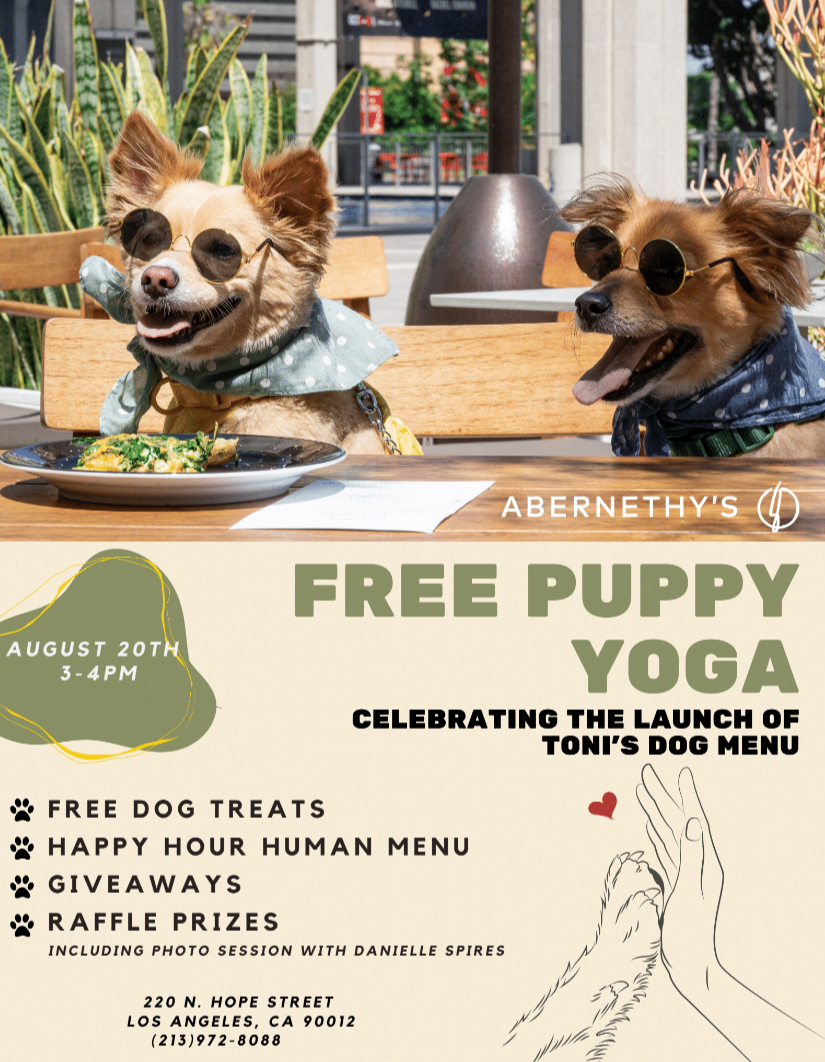 Downward Dog together and enjoy a Happy Hour and pup friendly 'Toni' menu at DTLA Abernethy's.