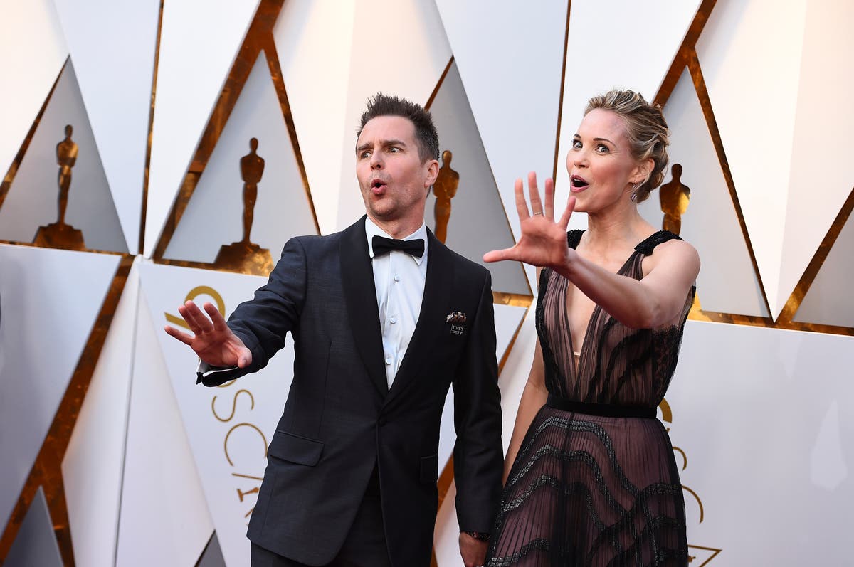 Sam Rockwell, left, and Leslie Bibb arrive at the Oscars (Photo by Jordan Strauss/Invision/AP)
