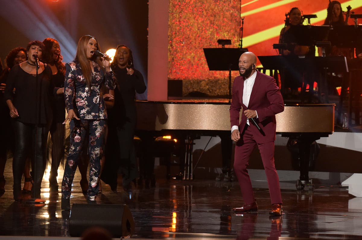 Yolanda Adams, left, and Common perform at the "Aretha! A Grammy Celebration For The Queen Of Soul" event at the Shrine Auditorium. (Photo by Richard Shotwell/Invision/AP)