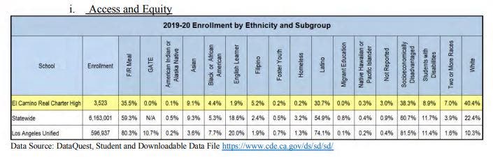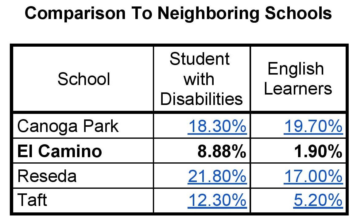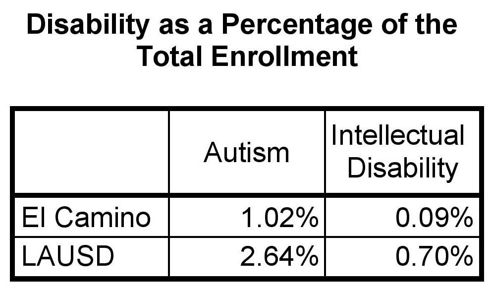 “El Camino Real Charter High has an 8.9% Special Education enrollment, which is lower than the state’s percentage of 11.7%, and lower than the District’s percentage of 13.9%.”
