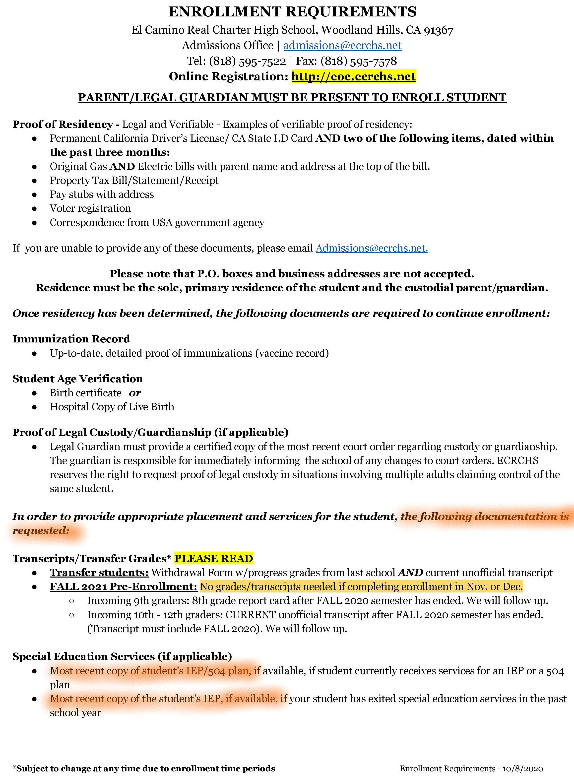 It should also be noted that the CSD has failed to hold El Camino accountable for the admission rules set in its current charter. This document specifically states that the “Charter School shall not request or require submission of a student’s IEP, 504 Plan, or any other record or related information prior to admission, participation in any admissions or attendance lottery, or pre-enrollment event or process, or as a condition of admission or enrollment.” Despite this restriction, El Camino asks prospective parents to provide the “most recent copy of student’s IEP/504 plan”. The school even wants this paperwork if the “student has exited special education services in the past school year.”