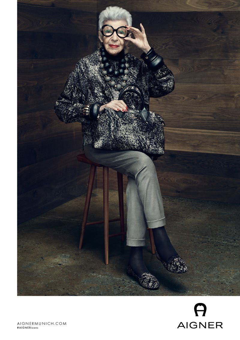 At 95 years old, the timeless entrepreneur and fashion icon Iris Apfel joined the fall-winter 2016 campaign for Aigner. In recent years, Apfel has also starred in ad campaigns for Kate Spade New York and Alexis Bittar.