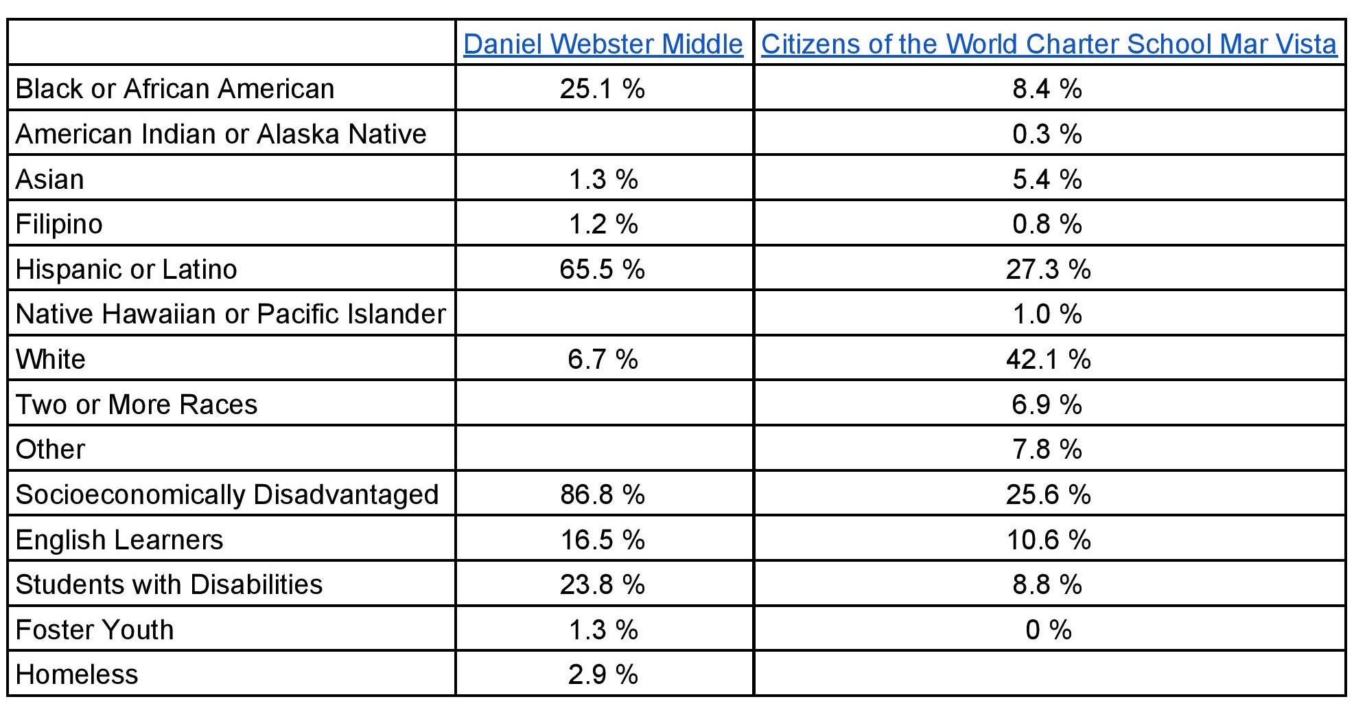While CWC says that their “school is an effective working model of the larger society students will someday join”, their demographics tell a different story. After all, it is difficult to create “meaningful school experiences that build cross-cultural understanding and tolerance” when they are stealing space from a public school whose student body looks much different than their own. Like many other charter schools, CWC falls behind public schools in serving students with special education needs. At the Mar Vista campuses, only 8.8% of the students have these needs. At Daniel Webster, 23.8% do. For the charter school, a quarter of the students are socioeconomically disadvantaged, while at the public school on the same campus, 86.8% are.