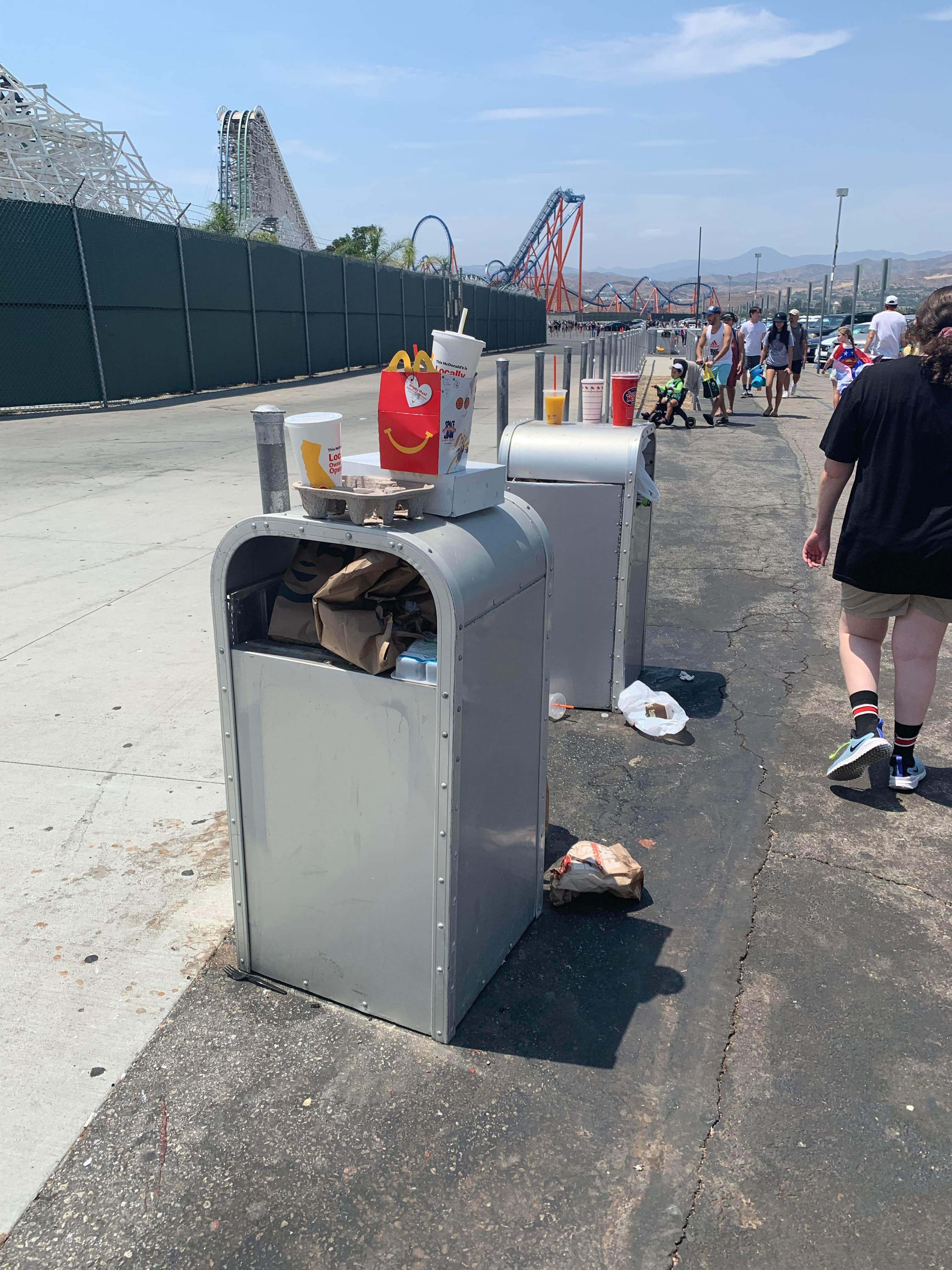 While Disneyland is still requiring guests to use a reservation system, Magic Mountain has discontinued the practice. This is despite the fact that the park appears to be short-staffed and unable to handle the number of people that they are admitting into the park. There are long lines at food service counters even with an online ordering system in place. Many games are closed and photo opportunities with costumed characters are few and far between. Even in the early afternoon garbage cans had reached capacity and were overflowing.