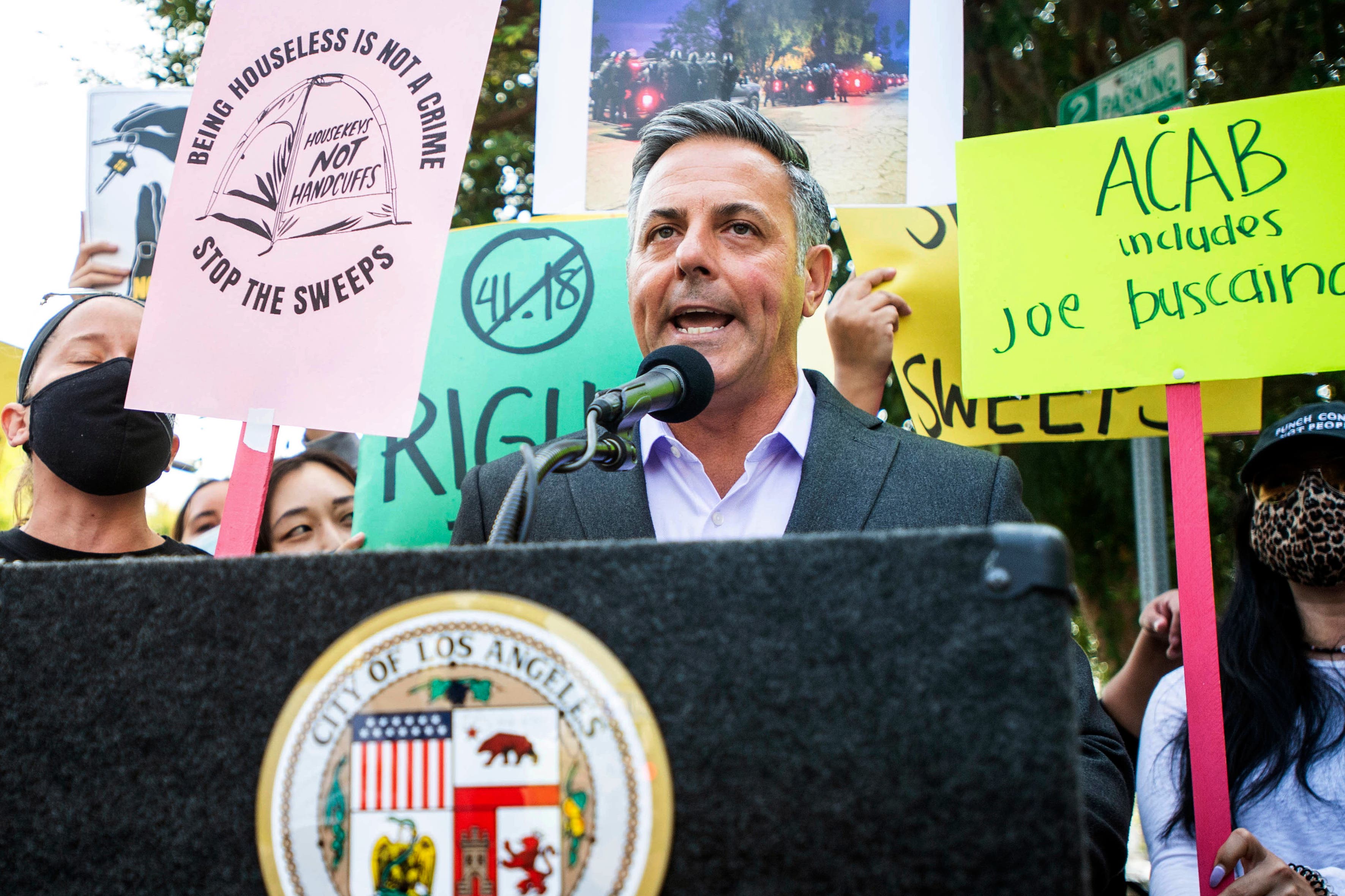 Residents "are scared," Caruso said in a brief interview with The Associated Press. "They're fed up. Can you imagine running a small business and you're worried about crime, and you also have a (homeless) encampment in front of your business?"