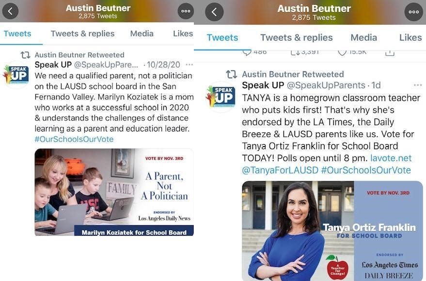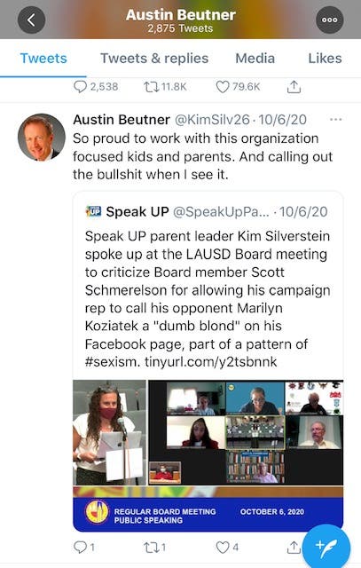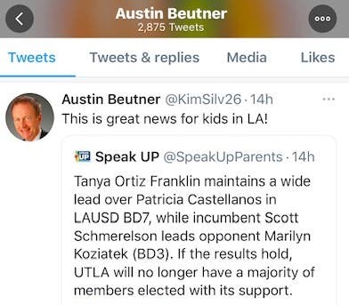 Leader from Board Member Nick Melvoin's Astroturf group, Speak Up, pretends to be Austin Beutner on Twitter and retweets campaign messages.