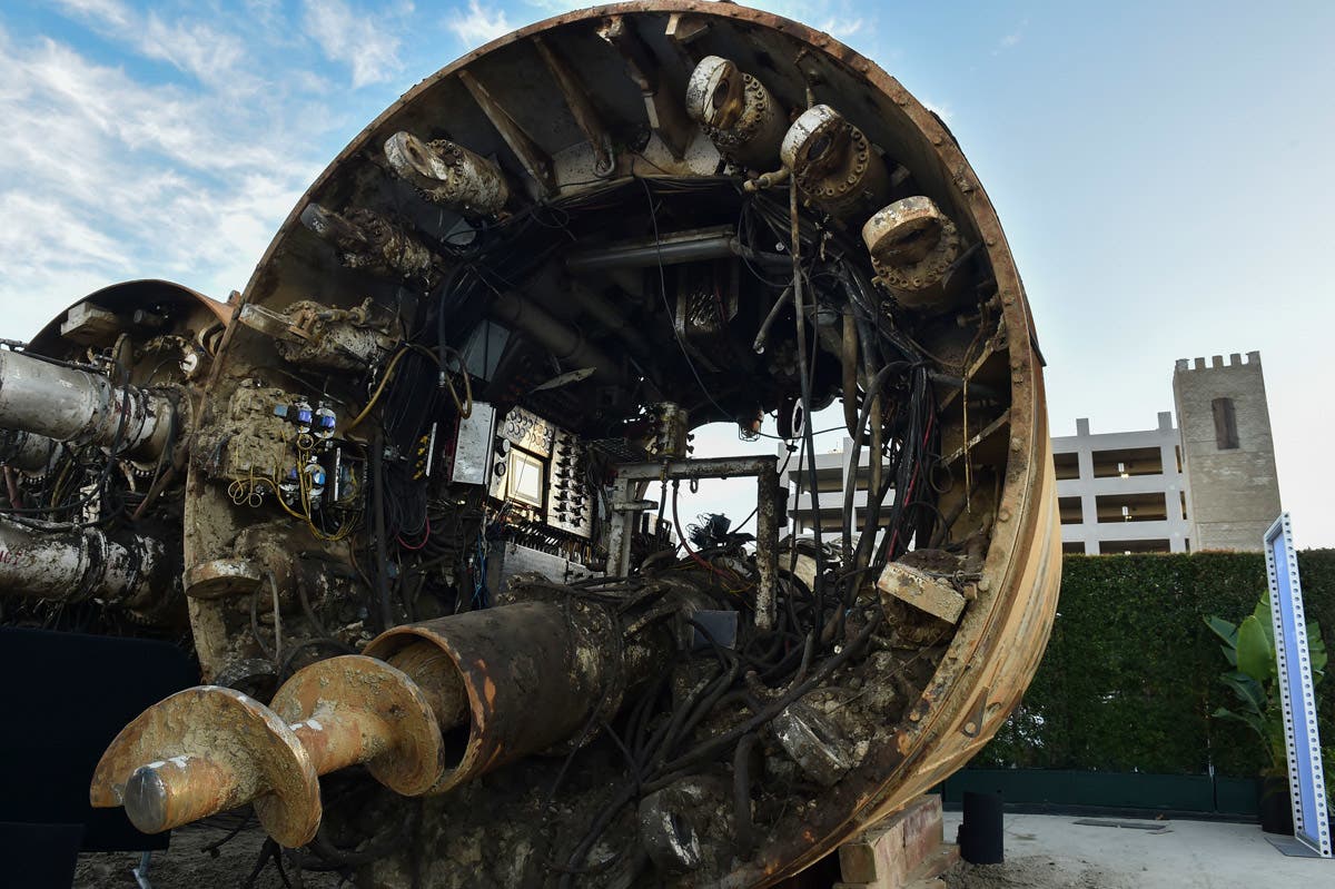 Tunnel boring equipment is displayed before an unveiling event for the Boring Company Hawthorne test tunnel . (Robyn Beck/Pool Photo via AP)