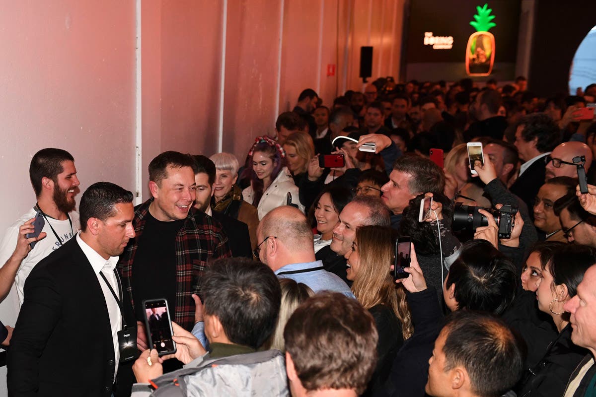 Elon Musk, third left, walks through the crowd during an unveiling event for the Boring Company Hawthorne test tunnel. (Robyn Beck/Pool Photo via AP)