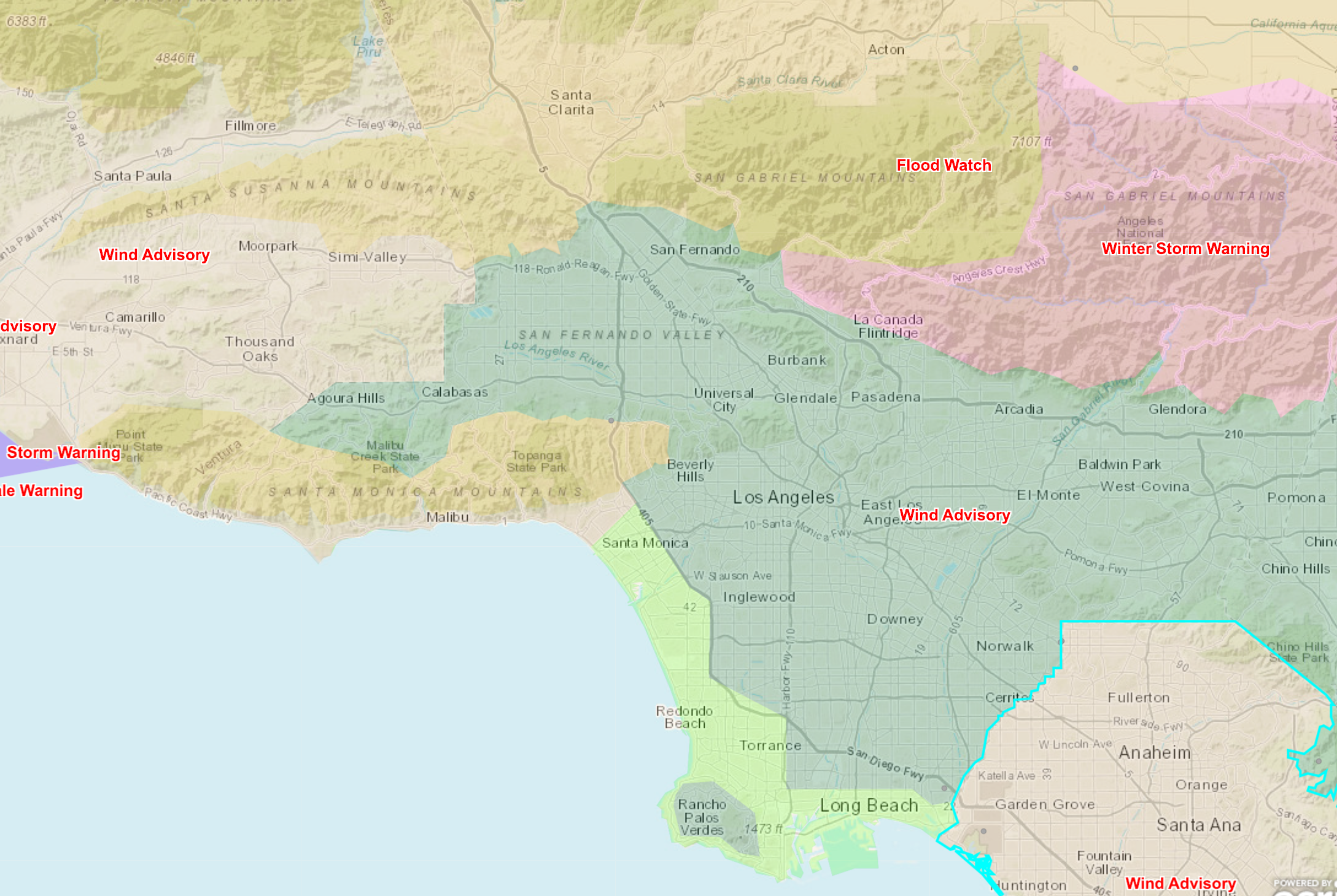 The heavy rain will be accompanied by strong winds in many areas, blowing at speeds of 30 to 50 mph in parts of LA County, and reaching up to 60 to 80 mph in higher mountain areas and the Golden State (5) Freeway corridor.
