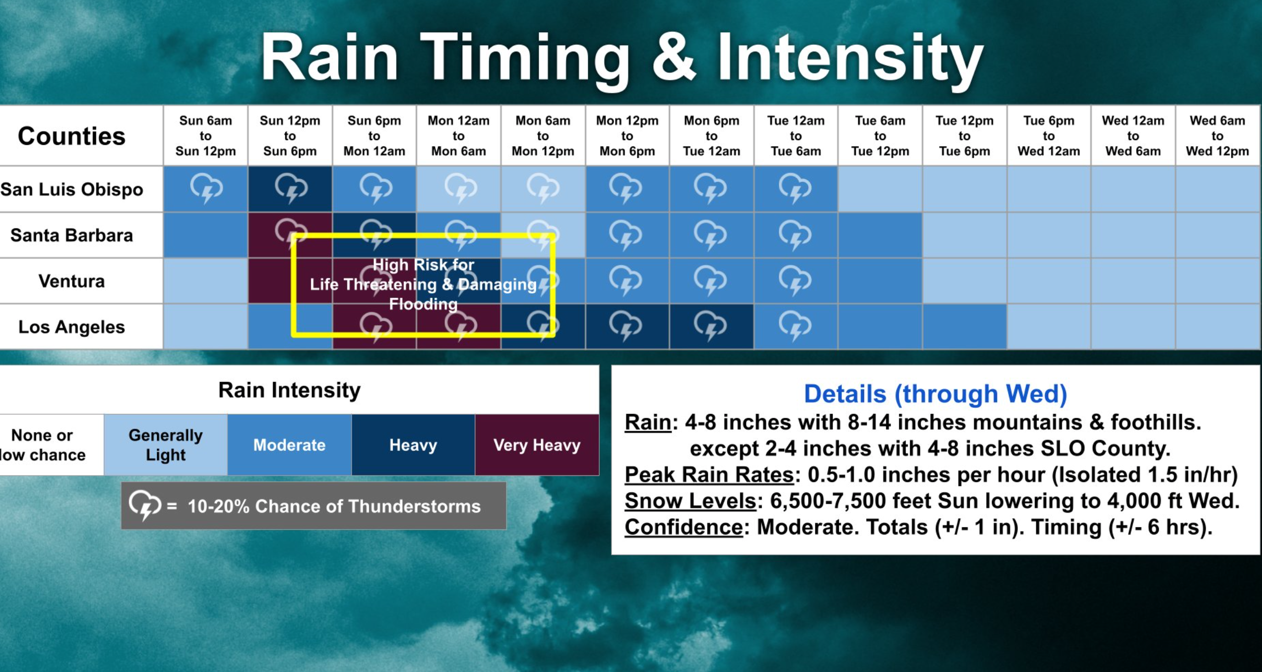 Here are the latest details on the upcoming storm. This is a DANGEROUS SYSTEM with major risks to life and property. Substantial flooding. Residents should heed any evacuation orders. Stay off the roads, especially the freeways, this afternoon through at least Monday morning. pic.twitter.com/z7uVIvKMAN