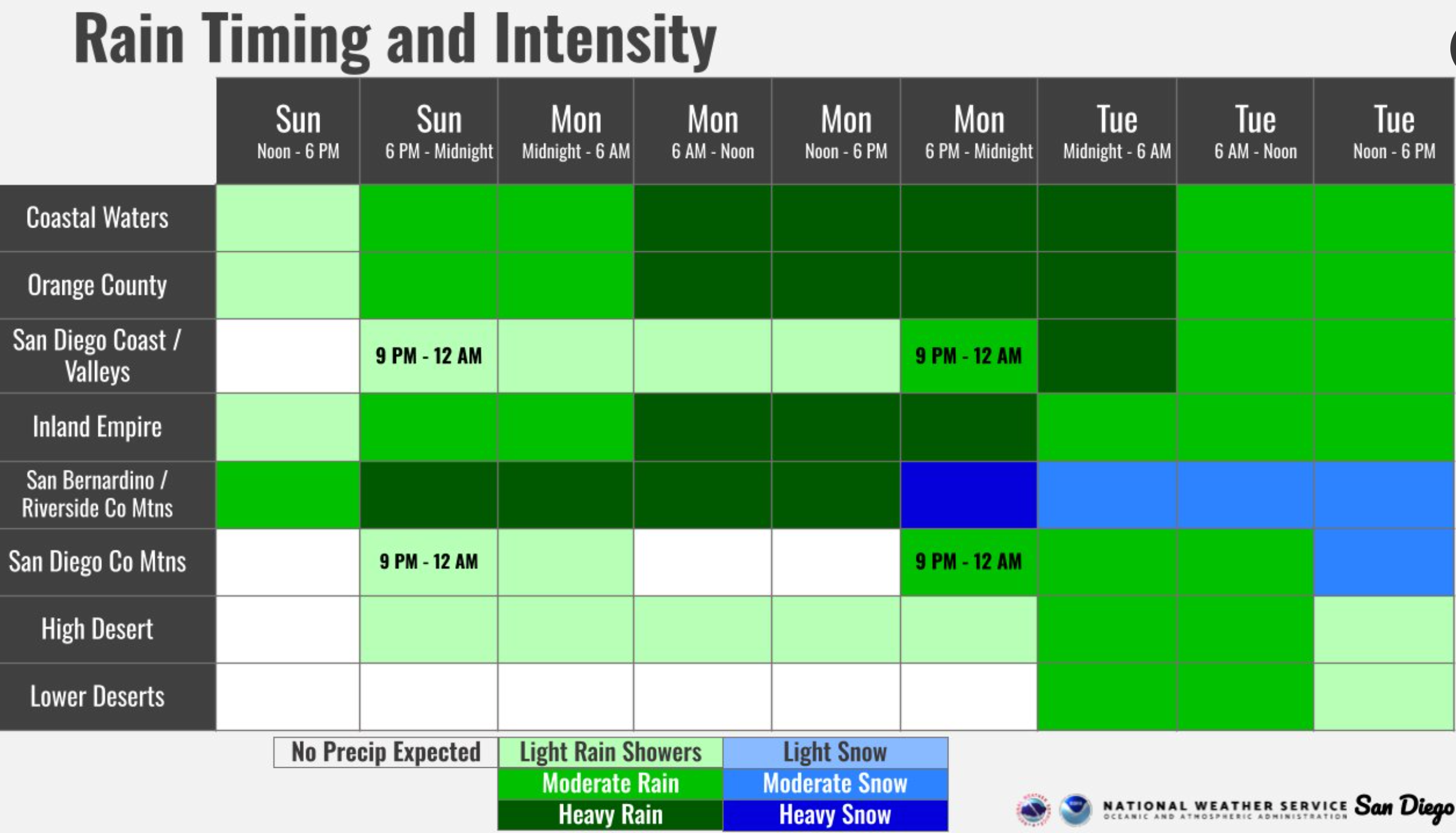 The multiple-day storm could drop 3 to 6 inches of rain in coastal and valley areas, and 6 to 12 inches in the mountains, with much of that downpour occurring in a 24- to 36-hour period between Sunday into Monday, according to the National Weather Service.