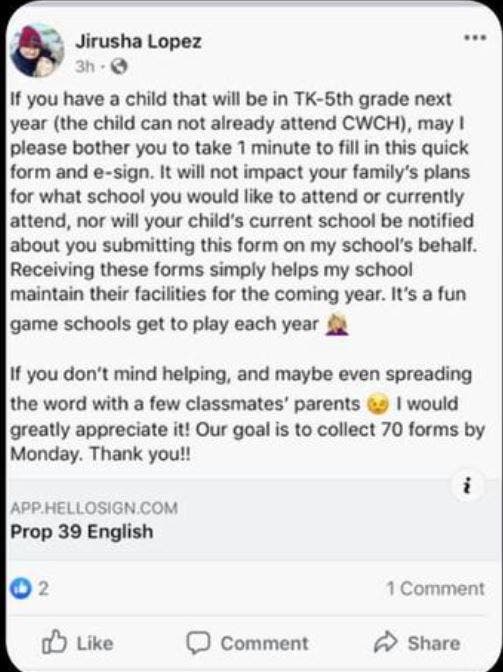 A Facebook post by Jirusha Lopez, the principal of COW’s Hollywood campus, provides some insight into how this charter chain scams the system. While the estimate of attendance is supposed to be based on students who have expressed a “meaningful interest” in the program, Lopez took to social media to ask parents to sign a Prop 39 form even if they had no plans to attend the charter school. In fact, she promised that completing the form would “not impact your family’s plans for what school you would like to attend or currently attend.”