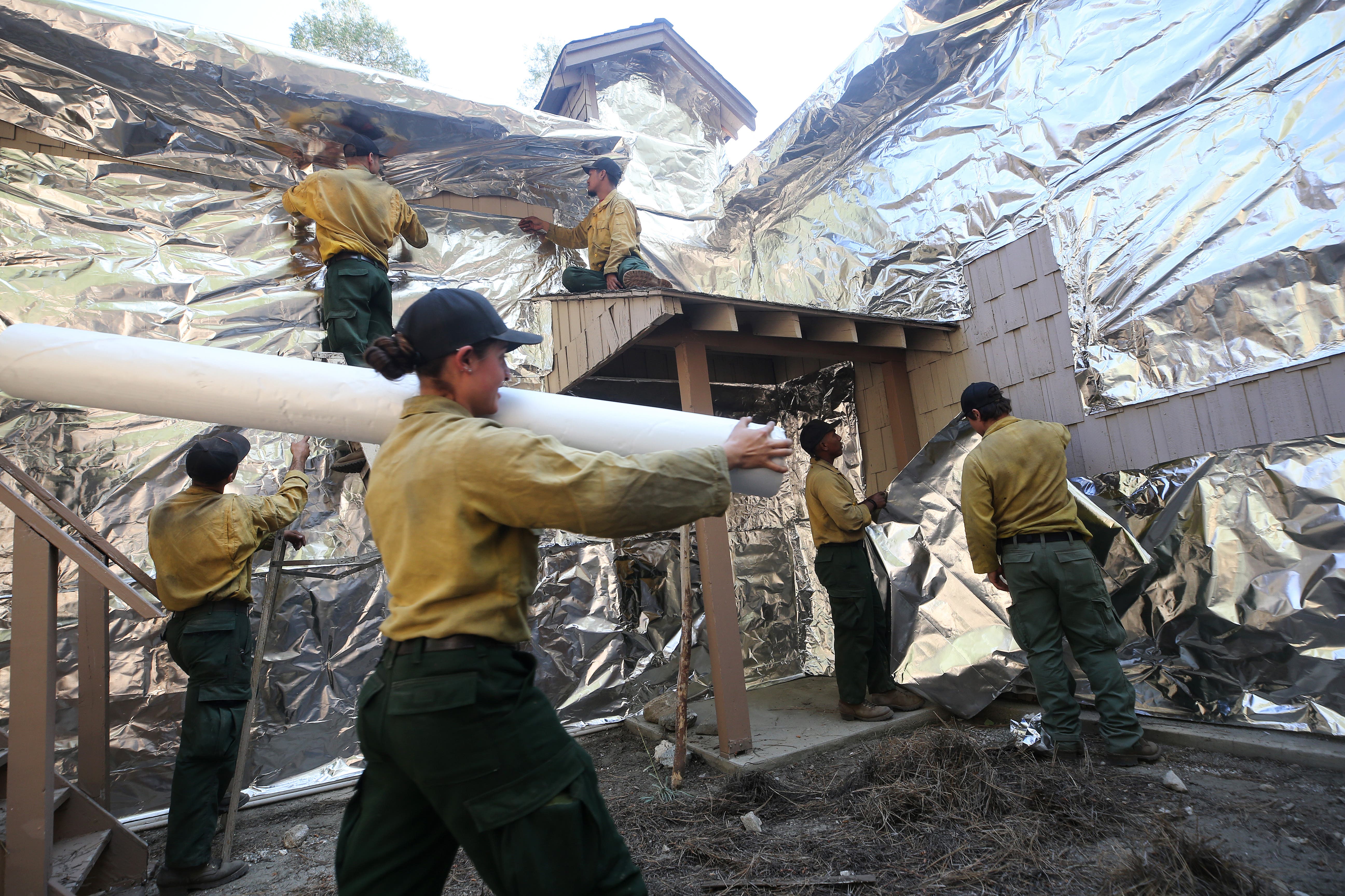 As this year's brutally hot summer turns to fall, crews are in a race to contain the blaze before the onset of the destructive Santa Ana winds. Weather conditions favored the firefighter effort Tuesday, but warmer and drier conditions were expected Wednesday and Thursday, with southwesterly and up canyon winds, according to the National Weather Service.