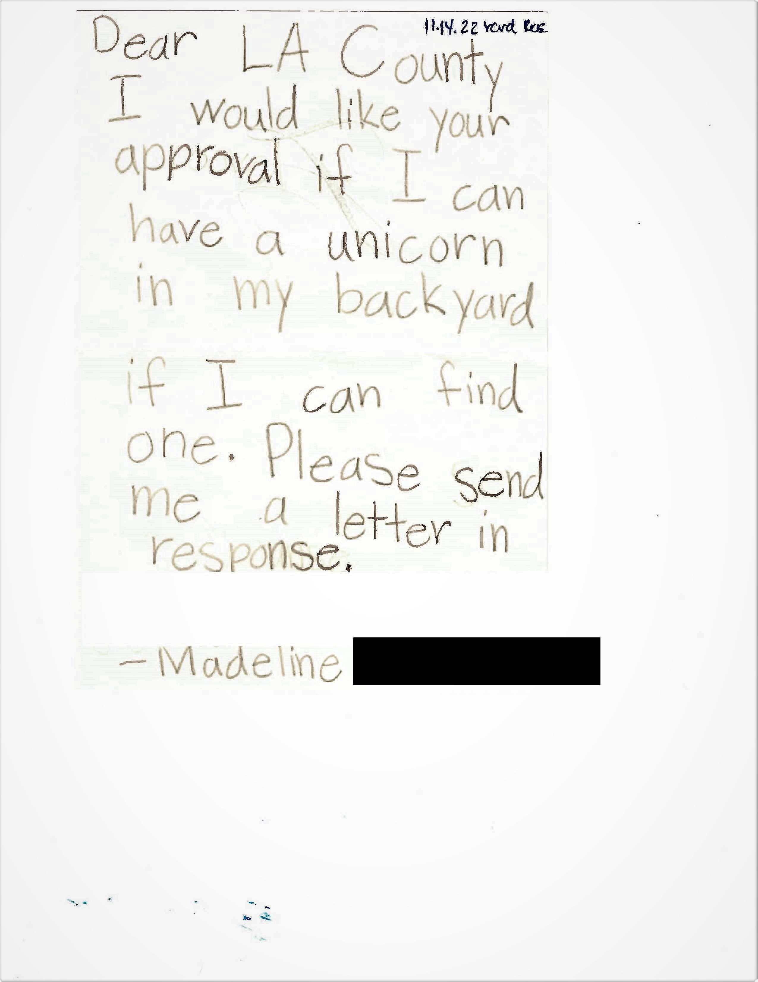 "Dear LA County, I would like your approval if I can have a unicorn in my backyard if I can find one," Madeline wrote by hand in a note to the foundation dated November 14. " Please send me a letter in response."