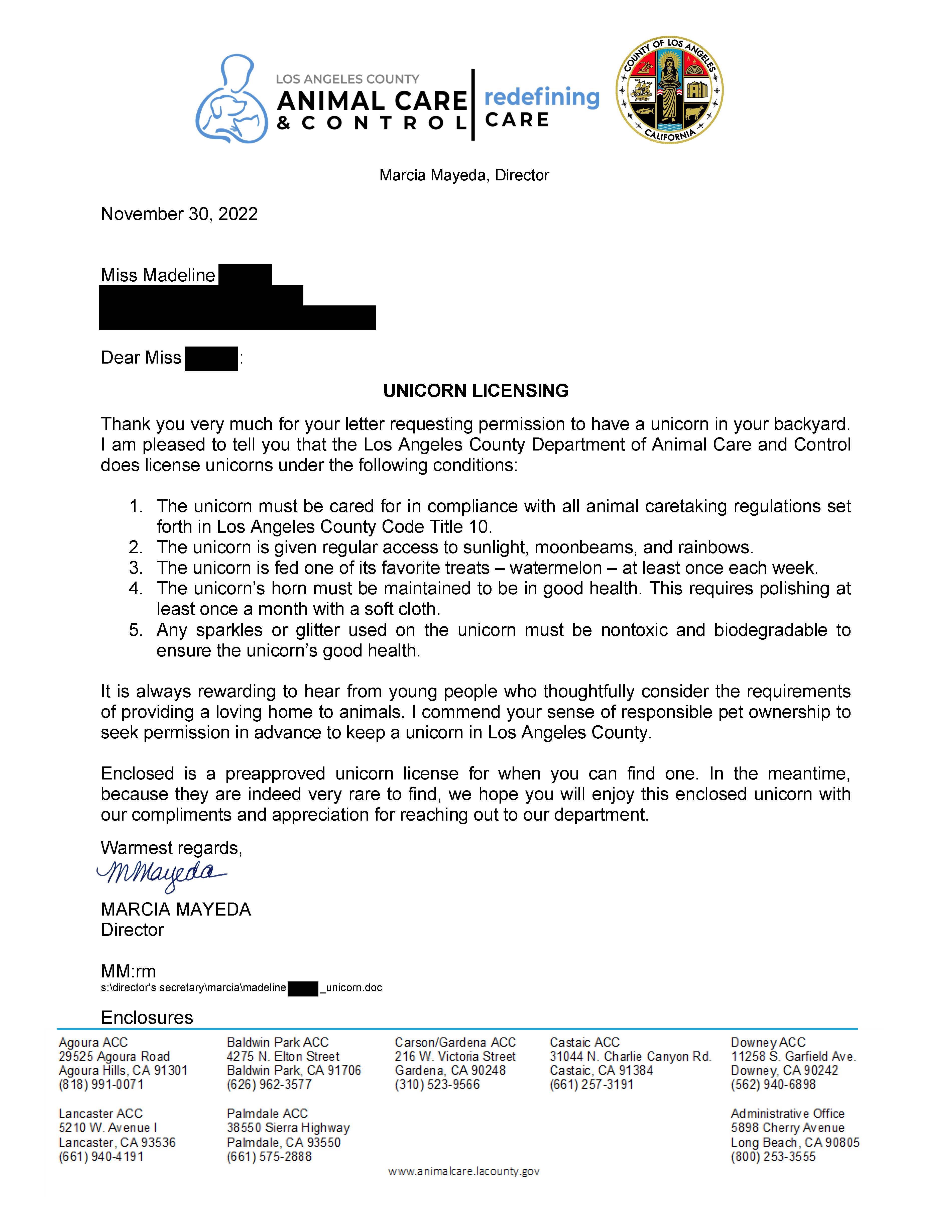 "It is always rewarding to hear from young people who thoughtfully consider the requirements of providing a loving home to animals," the letter said. "I commend your sense of responsible pet ownership to seek permission in advance to keep a unicorn in Los Angeles County."