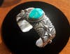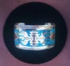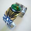 The work of Milford Calamity blends silver and gold in his bold, elaborate bracelets. Christopher Hoskie takes the art of metal stamping to new heights in his solid silver pieces. Frances Begay's gemstone bracelets recall the traditional style of metal work, with flower designs and braids surrounding deliciously blue turquoise.