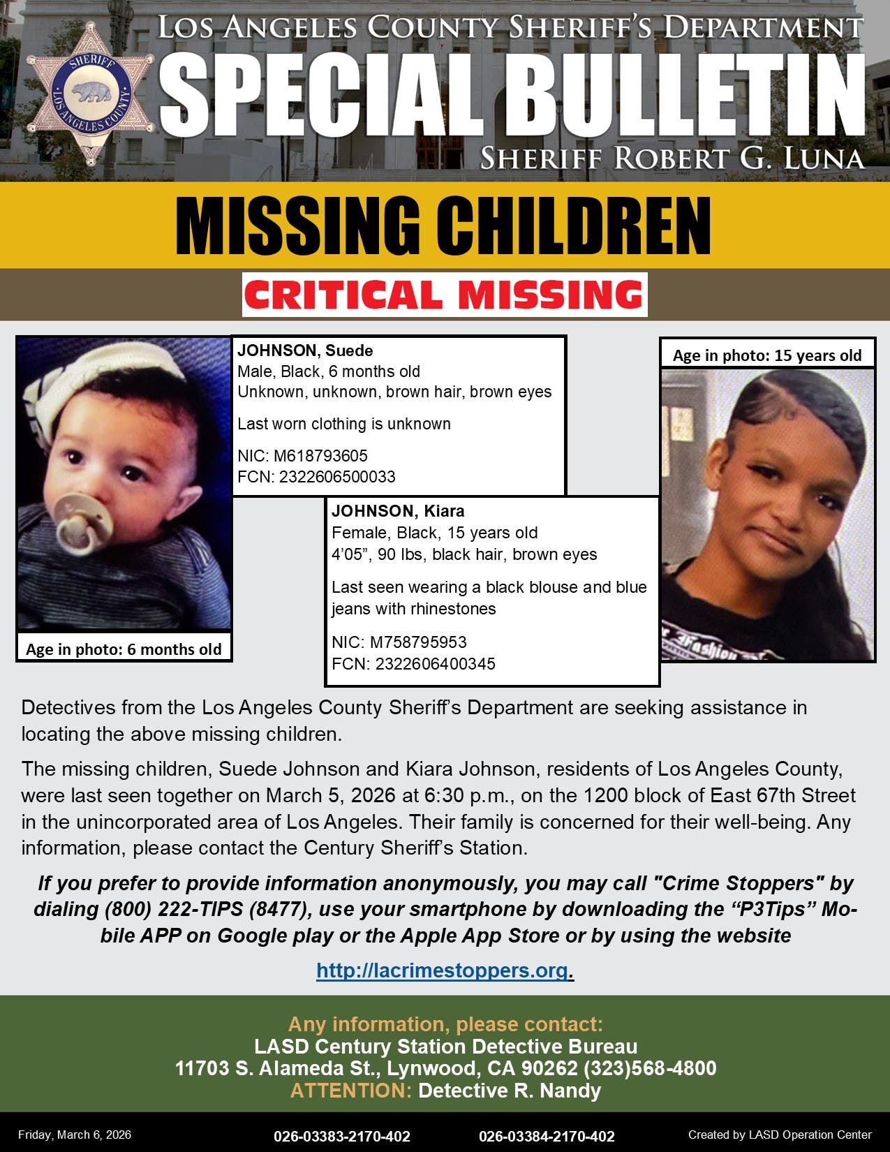 Kiara Johnson and her 7-month-old son Suede were last seen Thursday at 67th Street and South Central Avenue in the Florence area at around 6:30 p.m., according to the California Highway Patrol, which issued an Endangered Missing Advisory on behalf of the Los Angeles County Sheriff's Department.