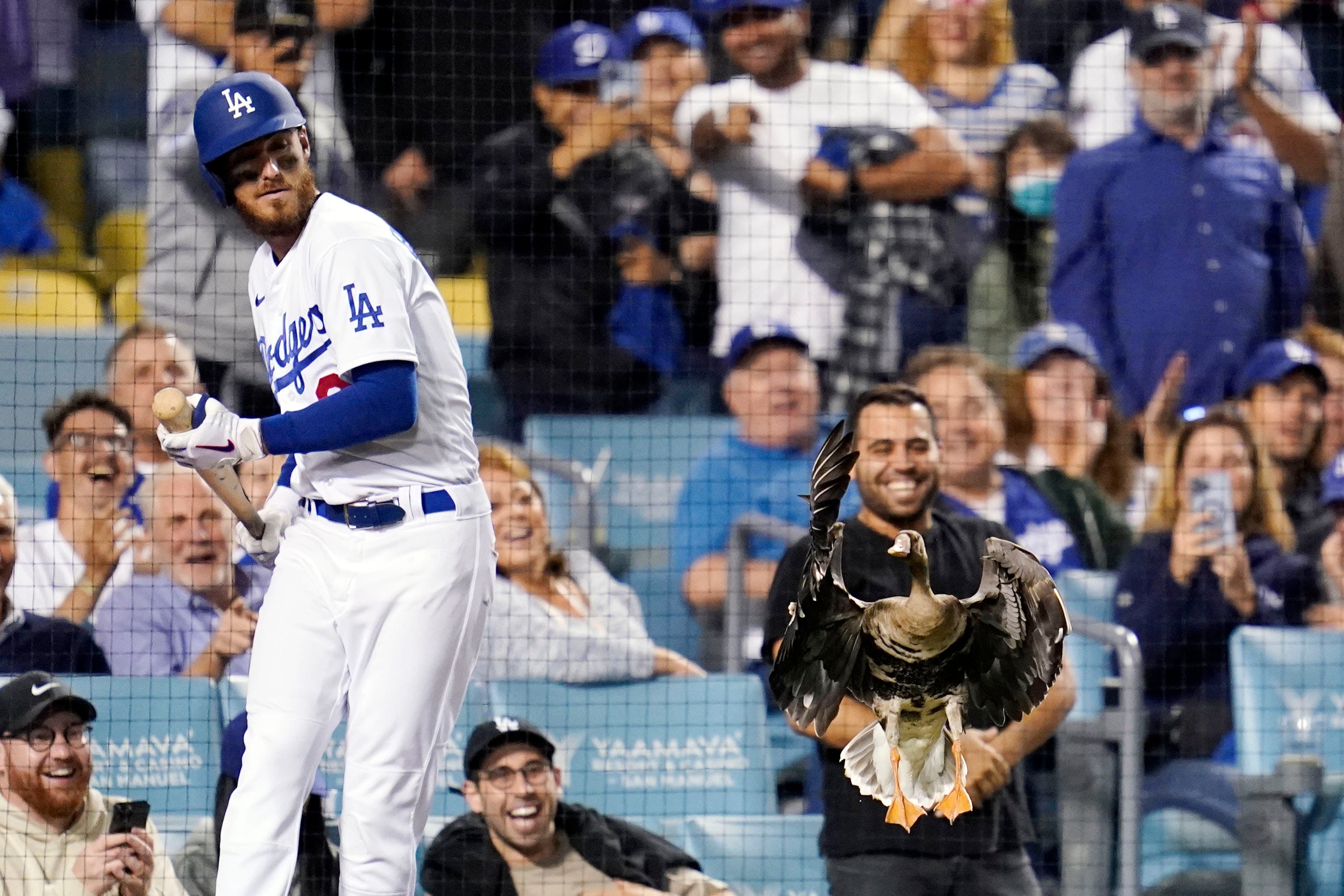 The grounds crew closed in on the goose, but the bird took off, flying all the way to near the Dodgers' on-deck circle, where Cody Bellinger was standing.