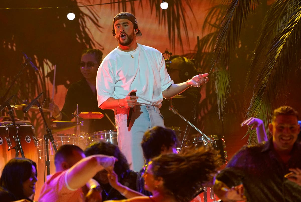 Bad Bunny performs a medley on stage. (AP Photo/Chris Pizzello)
