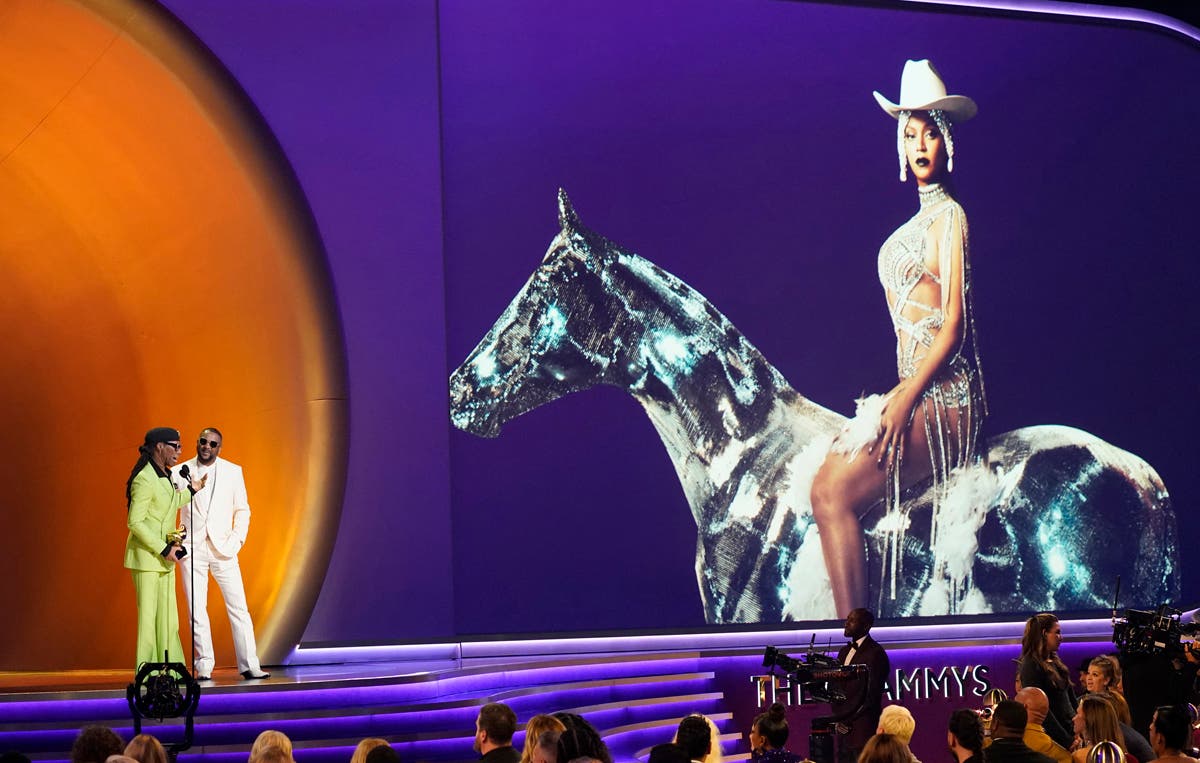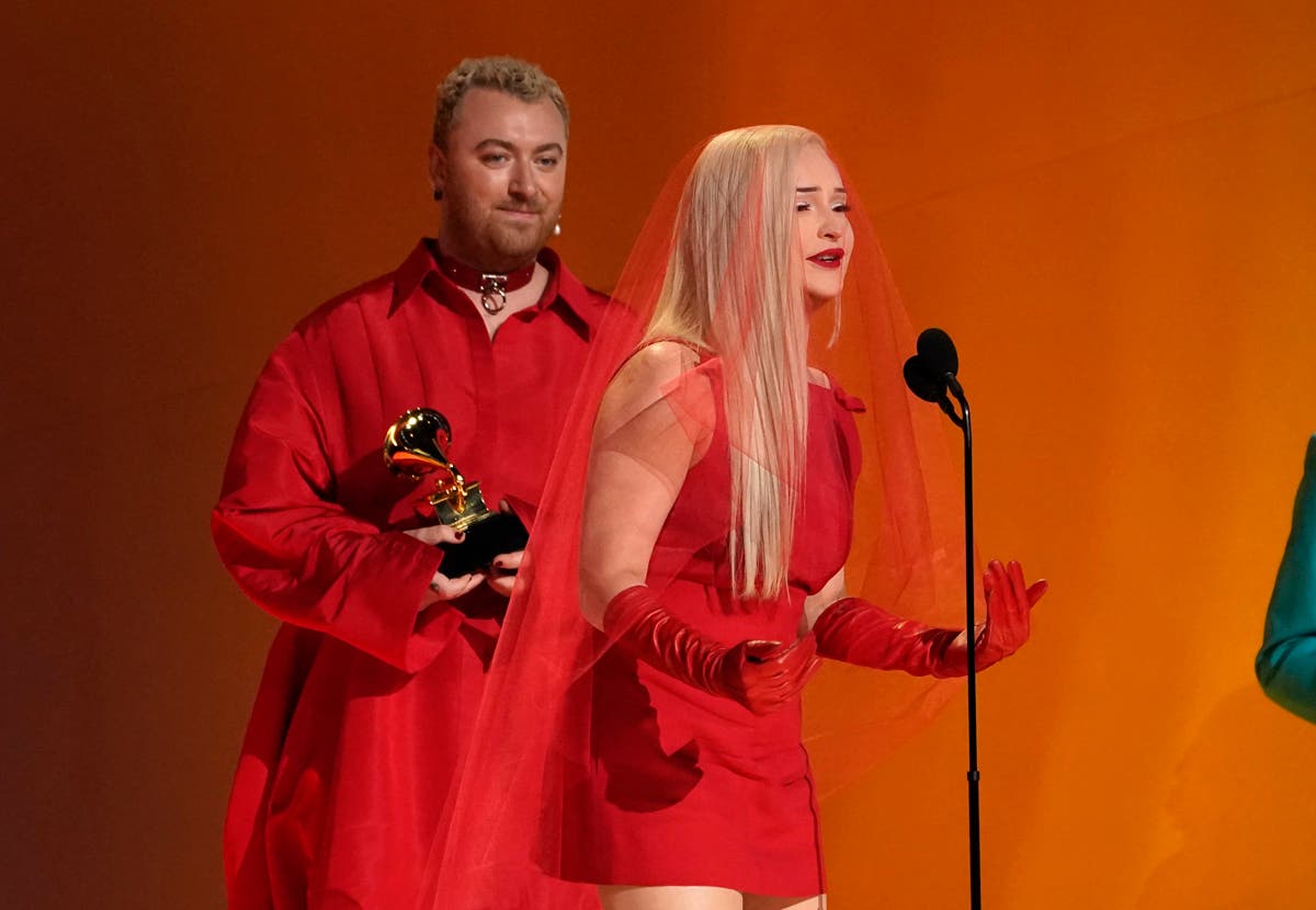 Kim Petras, right, and Sam Smith accept the award for best pop duo/group performance for "Unholy." (AP Photo/Chris Pizzello)Beyonce Stuck in TrafficNile Rodgers, left, and Gesteelde-Diamant accept the award for best R&B song for "CUFF IT" by Beyonce after the singer was nowhere to be found. Host Trevor Noah quickly told the audience that the superstar was stuck in L.A. traffic. (AP Photo/Chris Pizzello)